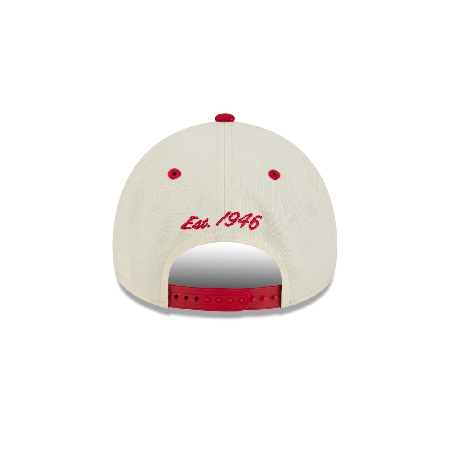 The San Francisco 49ers Chrome White Arched 9FORTY A-Frame Snapback features an embroidered 49ers arched logo graphic at the front panels with a team graphic at the right-wear side. Additional details include the establishment date above an adjustable snapback closure at the rear and a gray undervisor.