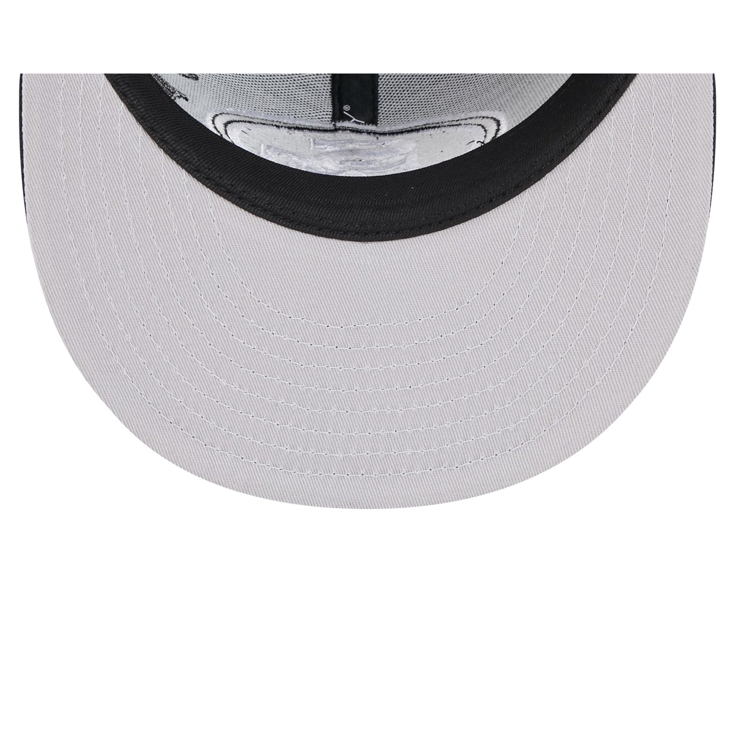 The San Francisco 49ers City Art 9FIFTY Snapback features an embroidered 49ers black and white logo at the front panels and an embroidered city banner with art at the right-wear side. Additional details include a snapback closure at the rear and a gray undervisor.