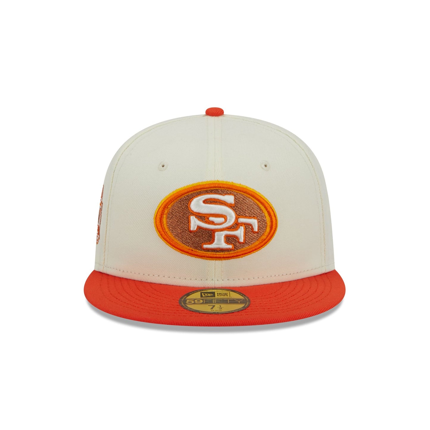 The San Francisco 49ers City Icon 59FIFTY Fitted Cap features an embroidered 49ers logo at the front panels with a Super Bowl XXIV patch at the right-wear side. Additional details include a city-inspired design at the rear and a gray undervisor.