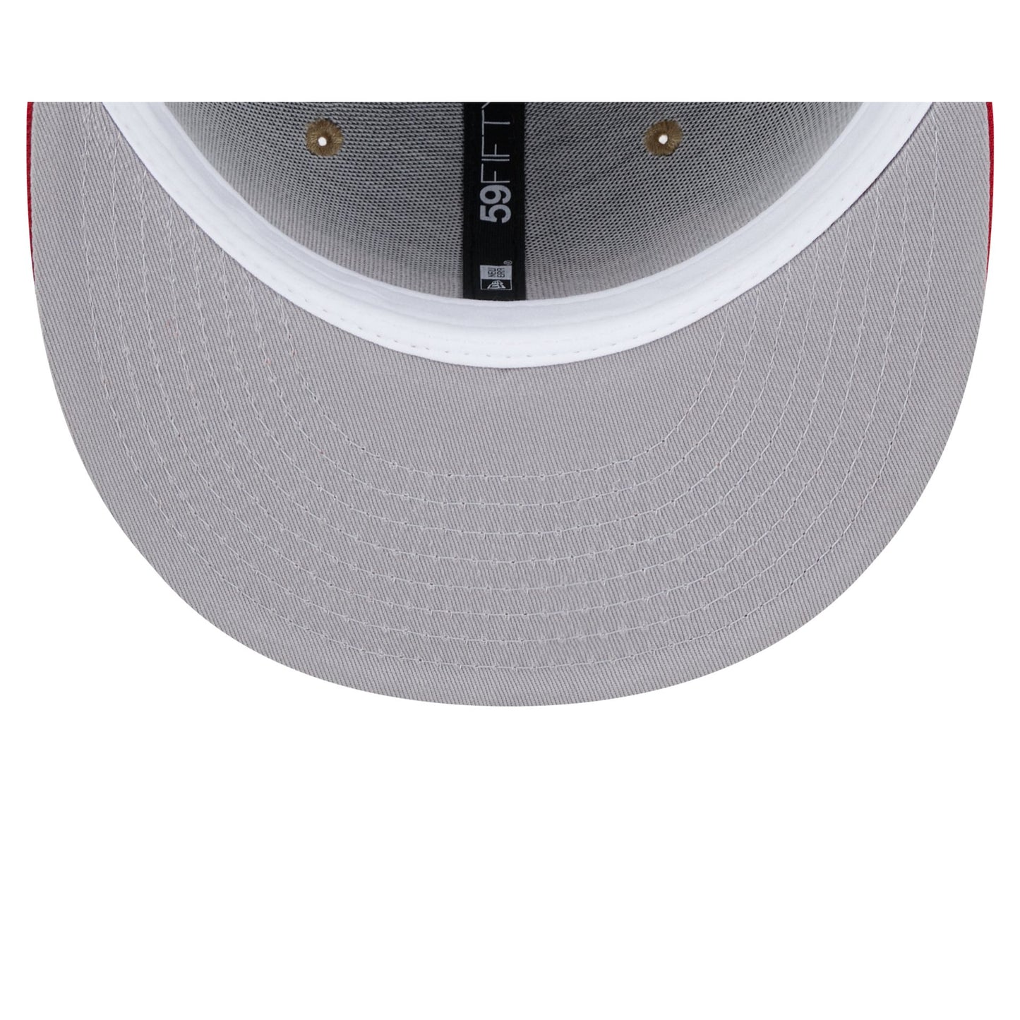 The San Francisco 49ers Classic 8-Bit Wordmark 59FIFTY Fitted Cap featured an embroidered 49ers Historic 8-bit stitch wordmark at the front panels. Additional details include a team wordmark with a matching MLB Batterman logo at the rear and a gray undervisor.