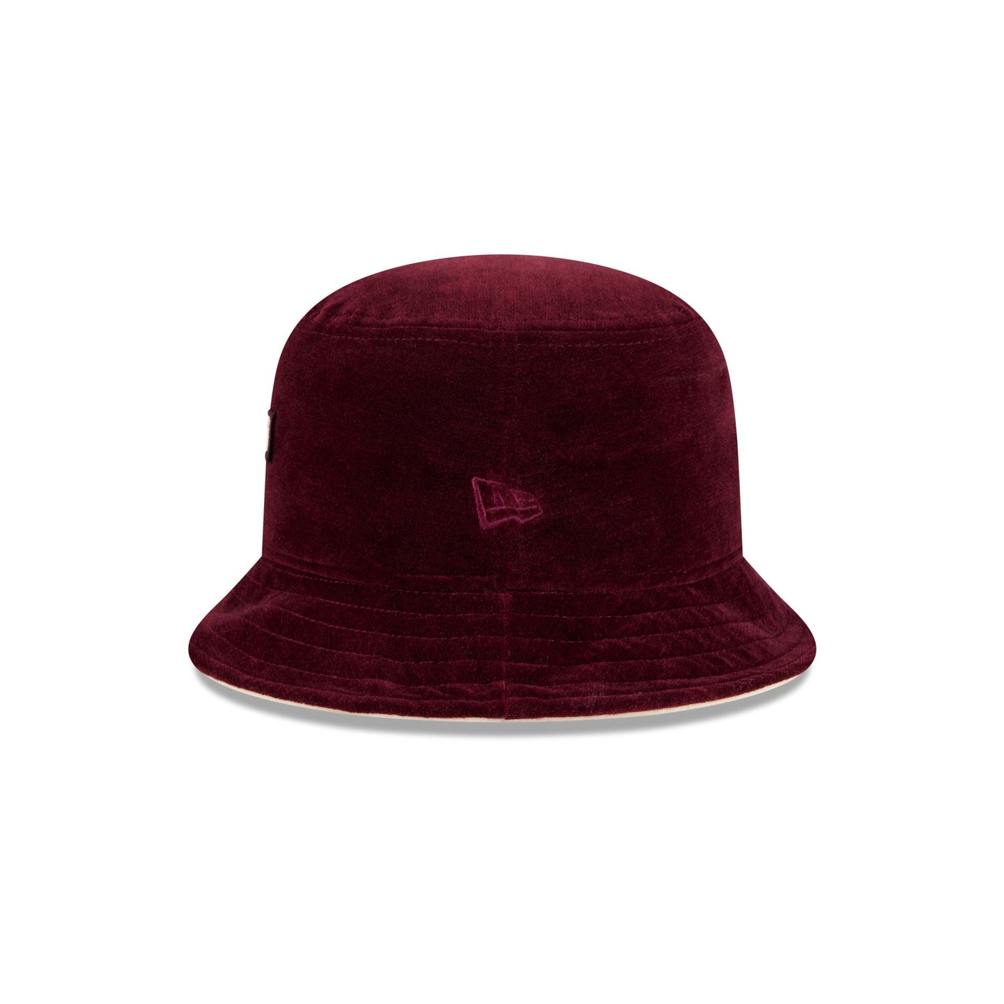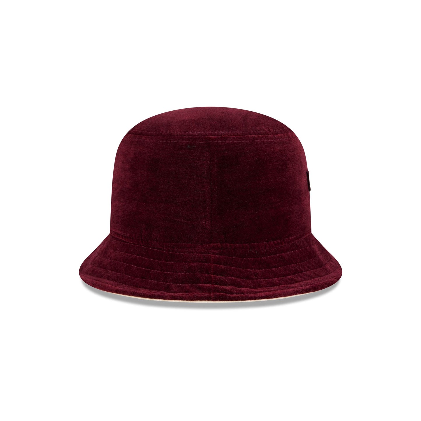 The San Francisco 49ers Fall Velvet Bucket Hat features a woven 49ers tag at the front with a red velvet fabrication throughout.