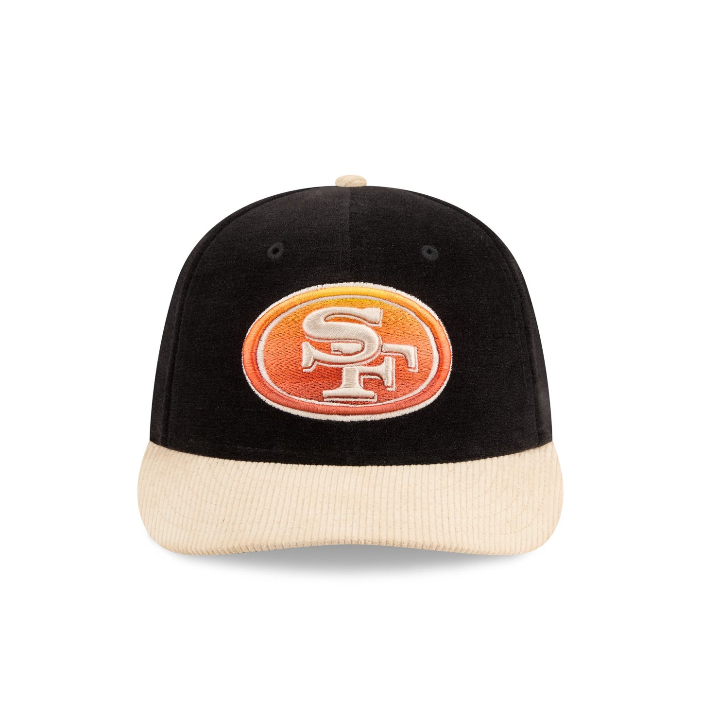 The San Francisco 49ers Fall Velvet Low Profile 59FIFTY Fitted Cap features an embroidered 49ers fall gradient logo at the front panels against a velvet fabrication throughout. Additional details include an antique brass leather stitch down city plate at the right-wear side, a matching NFL Shield logo at the rear, and a green undervisor.