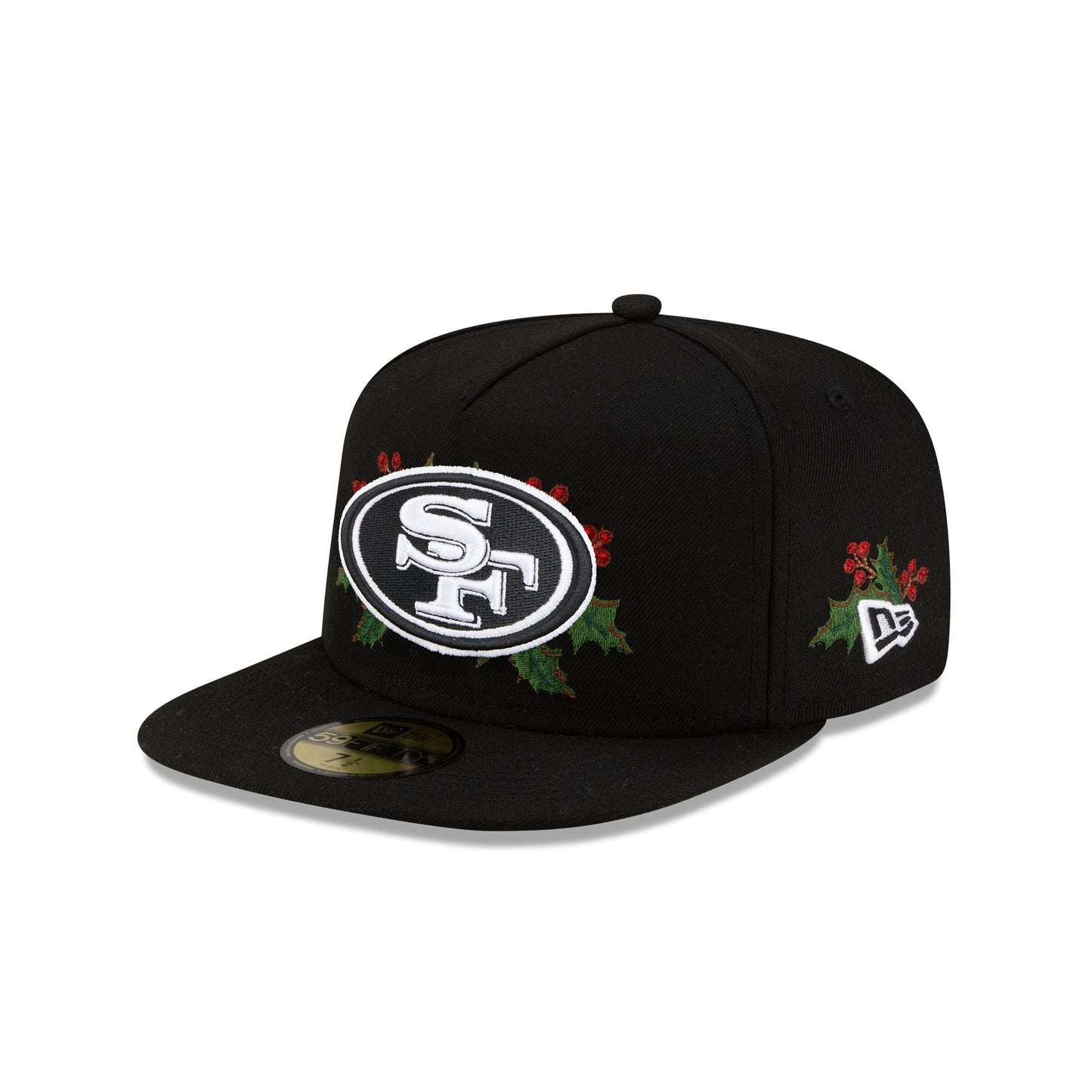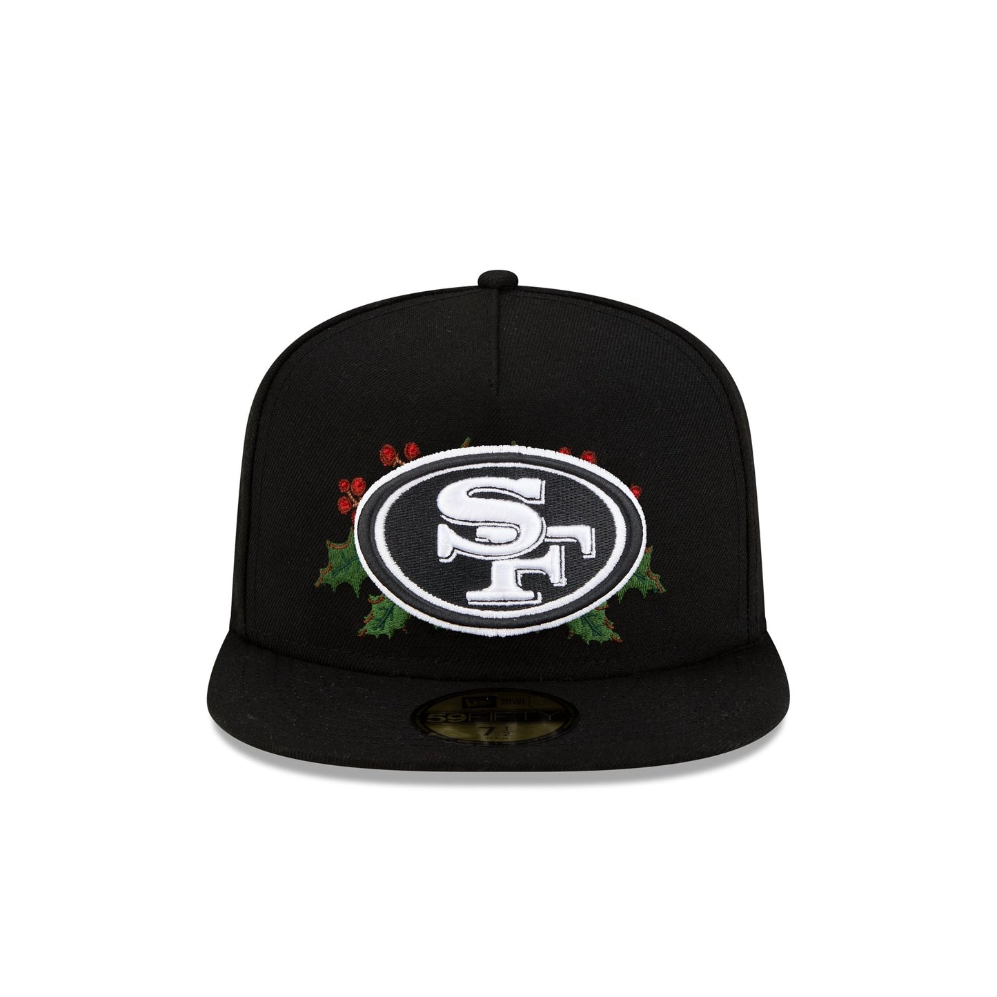 The San Francisco 49ers Holly 59FIFTY A-Frame Fitted Cap features an embroidered 49ers black and white logo with holly at the front panels with a matching NFL Shield logo at the rear. Additional details include a holly New Era Flag at the left-wear side and a black undervisor.