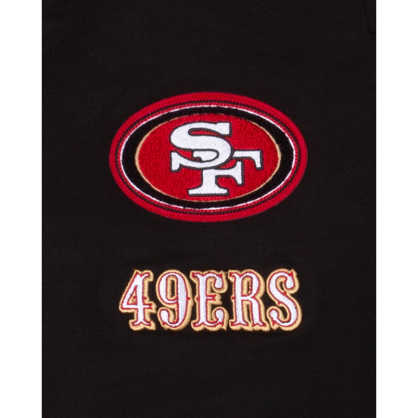 The San Francisco 49ers Logo Select Black Jogger features a chenille applique 49ers logo above an embroidered team wordmark at the left leg.