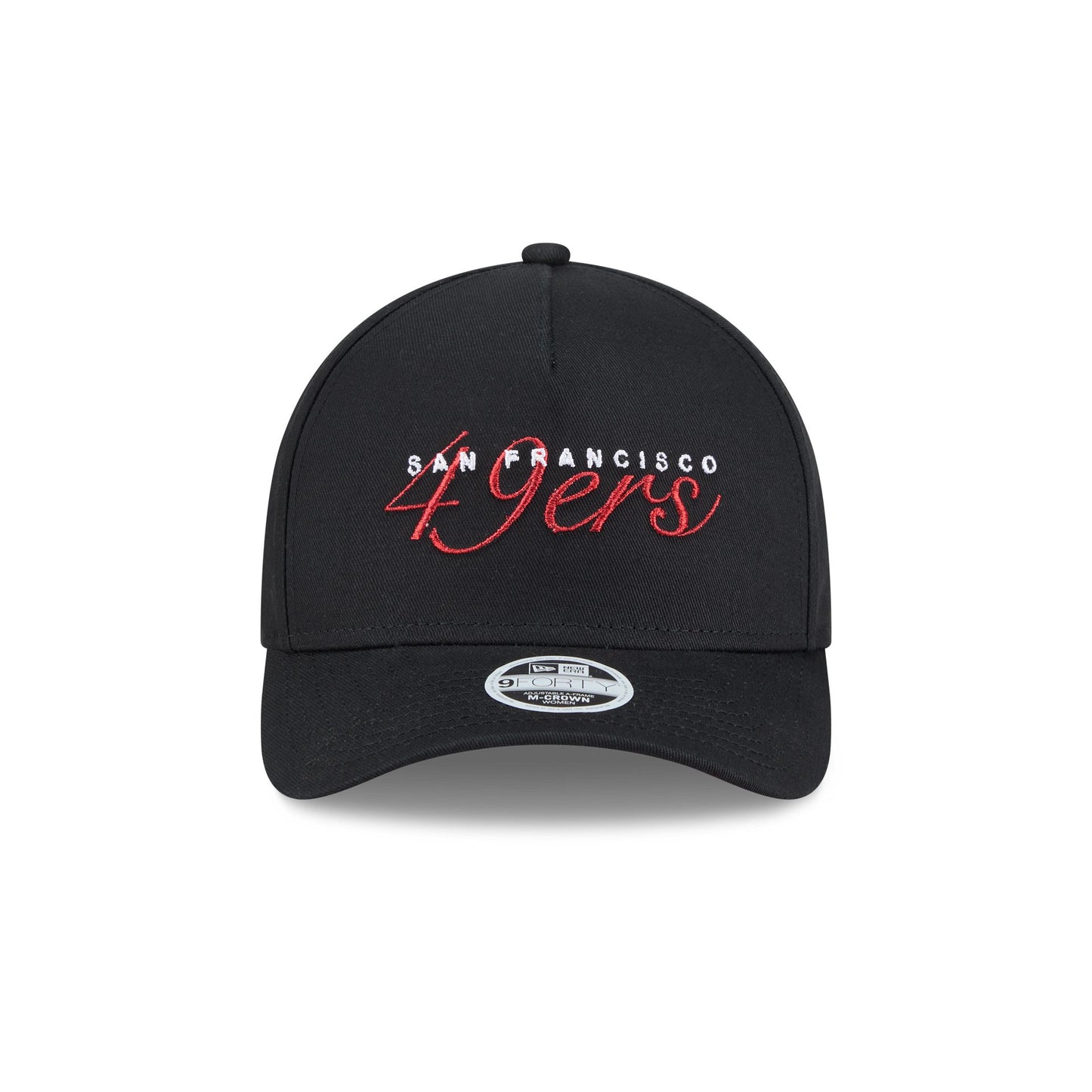 The San Francisco 49ers Metallic Women's 9FORTY M-Crown A-Frame Snapback features an embroidered 49ers metallic script wordmark at the front panel with a snapback closure at the rear and a satin undervisor.