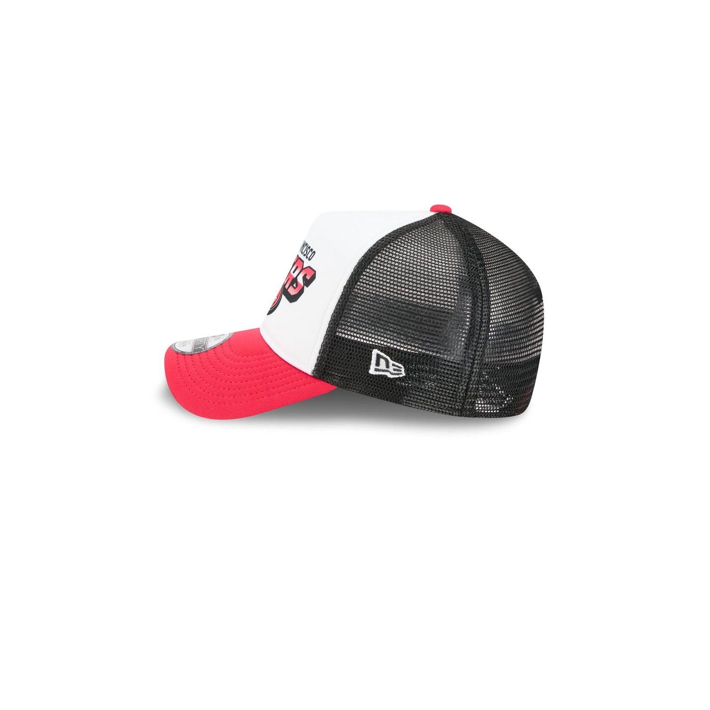 The San Francisco 49ers Shine Kids 9FORTY A-Frame Trucker features a screen-printed 49ers graphic at the front panels with an adjustable snapback closure at a mesh rear.