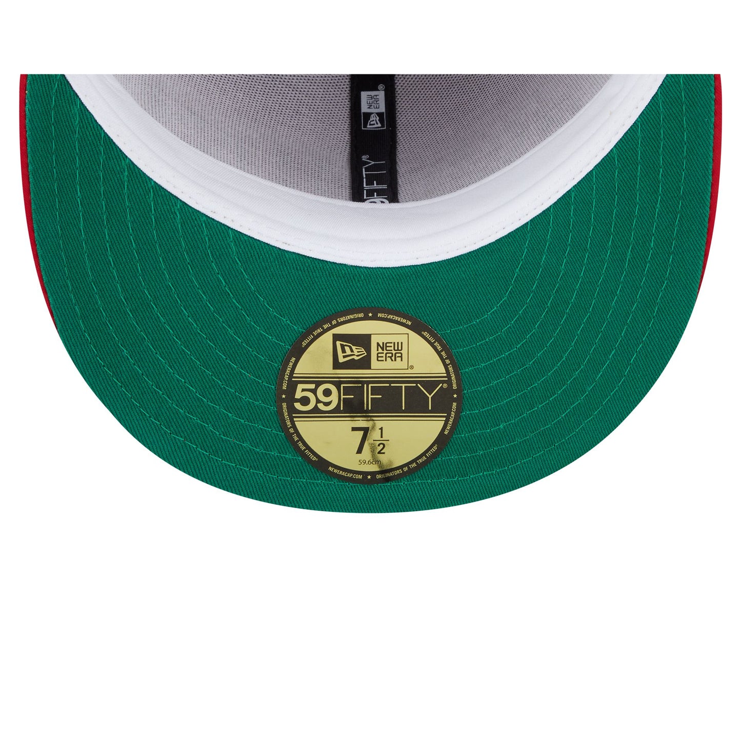 The San Francisco 49ers Spring Satin 59FIFTY Fitted Cap features an embroidered 49ers wordmark at the front panels with a New Era pin at the top left panel and an NFL Shield logo at the rear. Additional details include a satin fabrication throughout, a logo at the right-wear side, and a green undervisor.