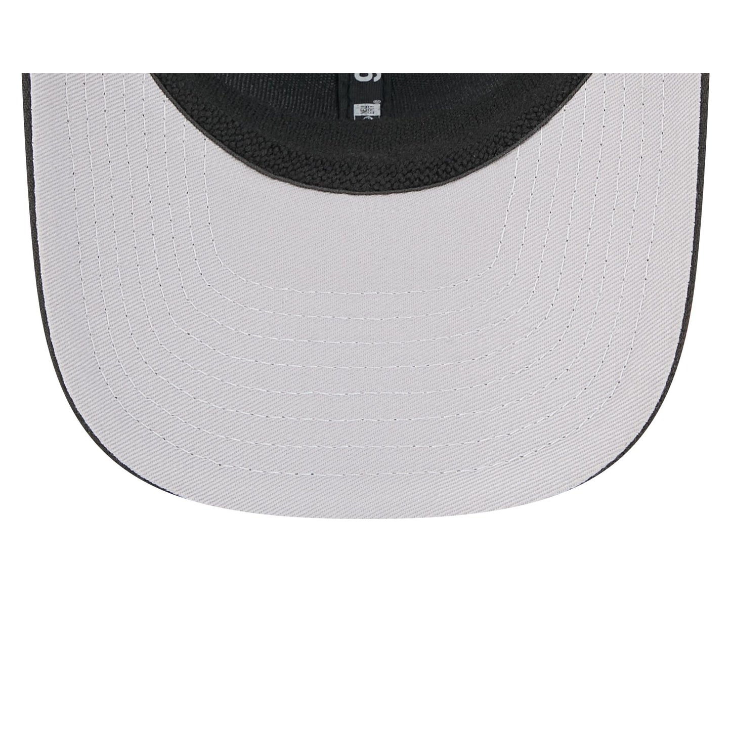 The San Francisco 49ers Team Black 9SEVENTY Trucker features an embroidered 49ers logo at the front panels with a matching NFL Shield logo above an adjustable snapback closure at a mesh rear and a gray undervisor.