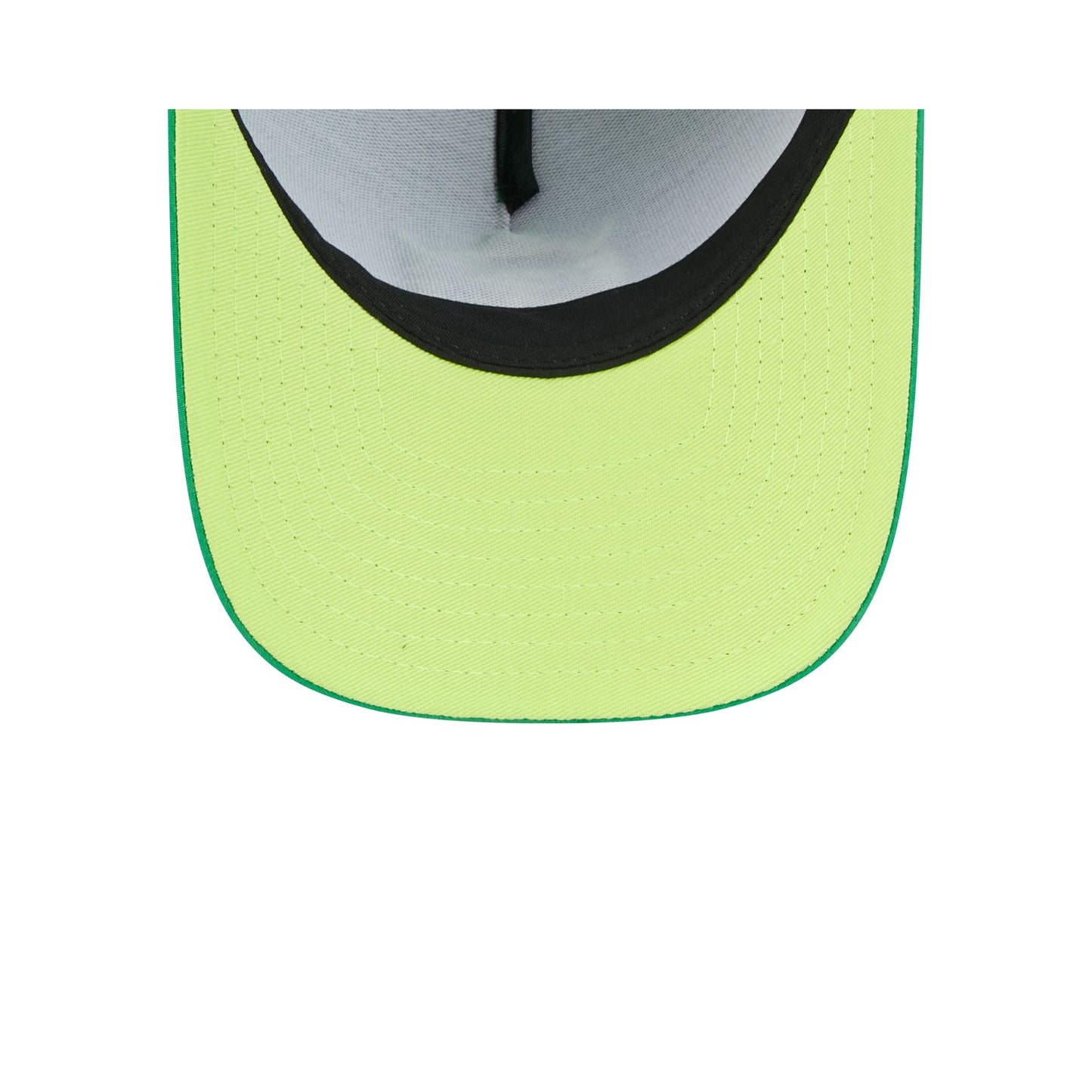 The San Francisco 49ers Tee Time 9FORTY M-Crown A-Frame Snapback features an embroidered 49ers golf logo at the front panels with a snapback closure at the rear and a neon green undervisor.