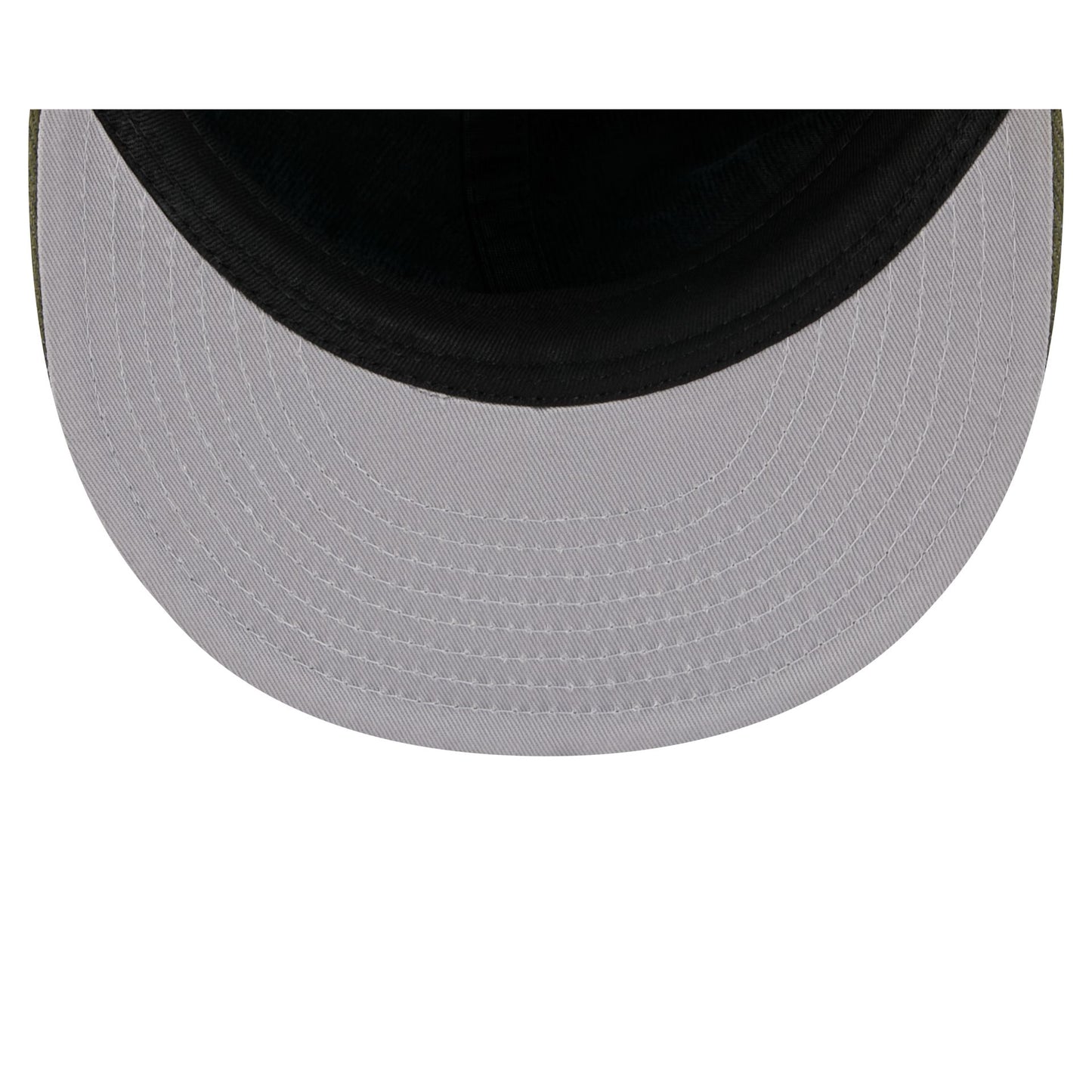 The San Francisco 49ers Three Looms Cotton Twill Camo Retro Crown Dog Ear 59FIFTY Fitted features an embroidered 49ers logo at the front panels with a matching NFL Shield at the rear. Additional details include fleece camo lined ear covers with a snap button closure and a gray undervisor.