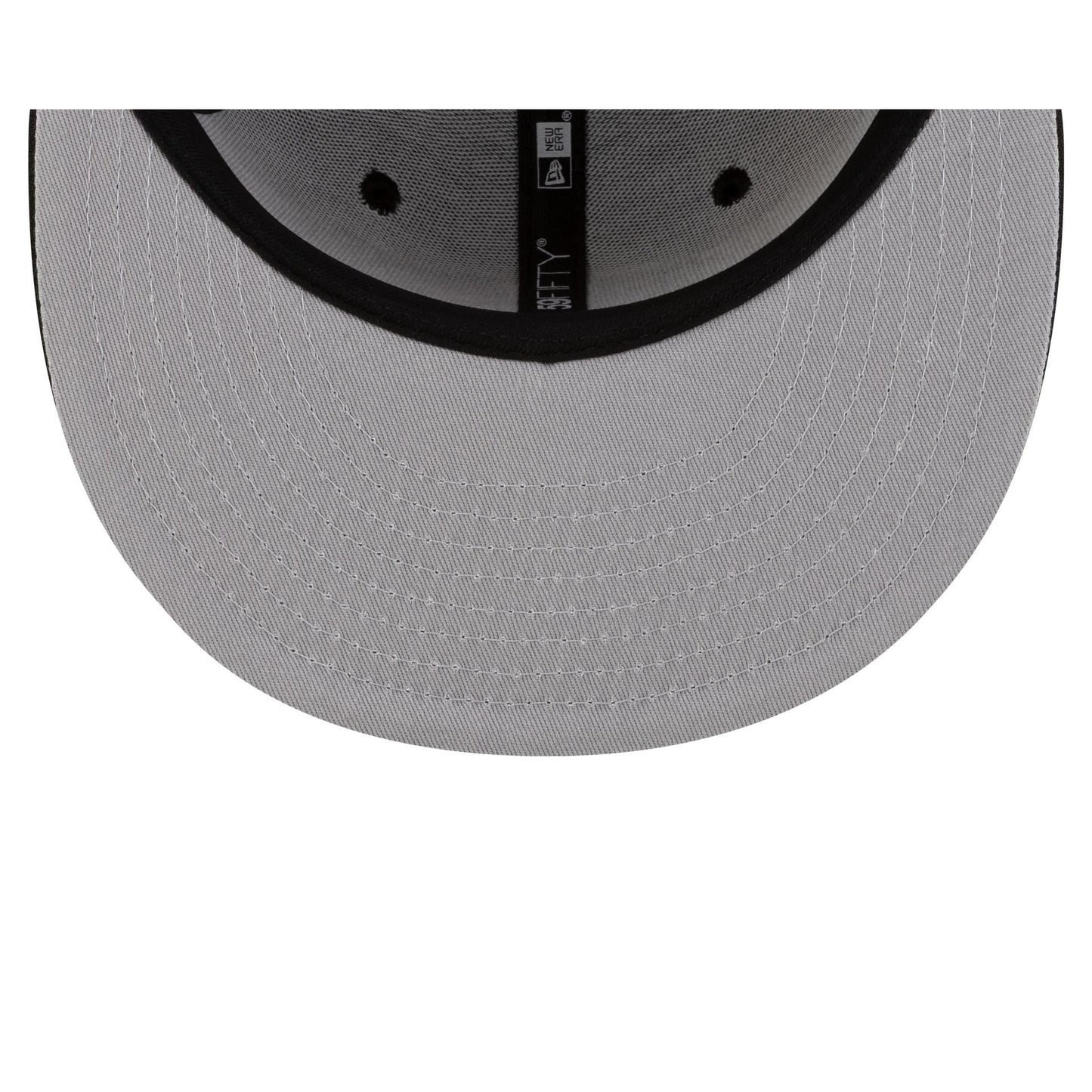 The San Francisco 49ers Two-Tone Pinwheel 59FIFTY Fitted Cap features an embroidered 49ers Historic logo at the front panels with a matching team wordmark at the rear. Additional details include a black and red paneled crown with a 60 Seasons patch at the right-wear side and a gray undervisor.