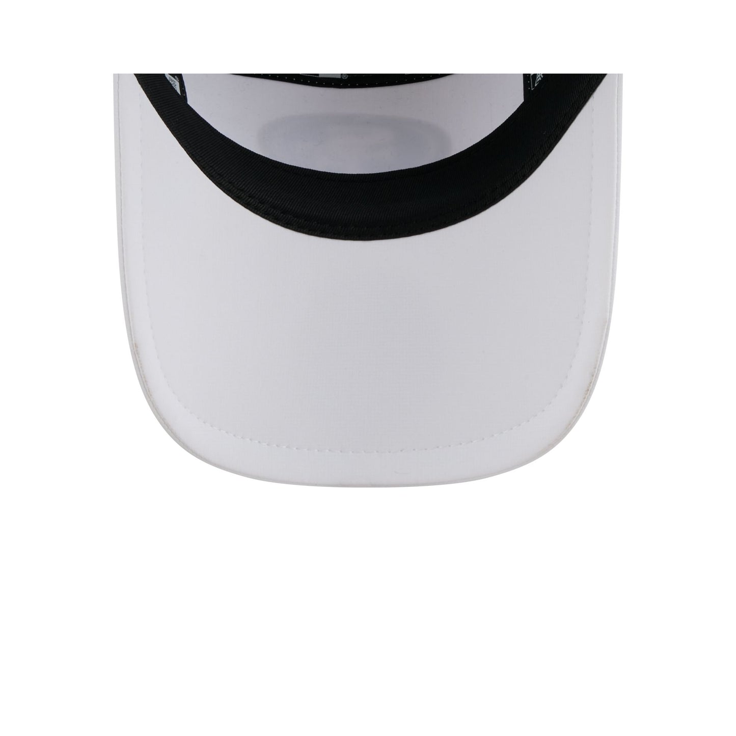 The San Francisco 49ers White Poly Runner Cap features a heat sealed 49ers logo at the front panels with mesh side panels. Additional details include a silicone patch above an adjustable drawstring closure at the rear.
