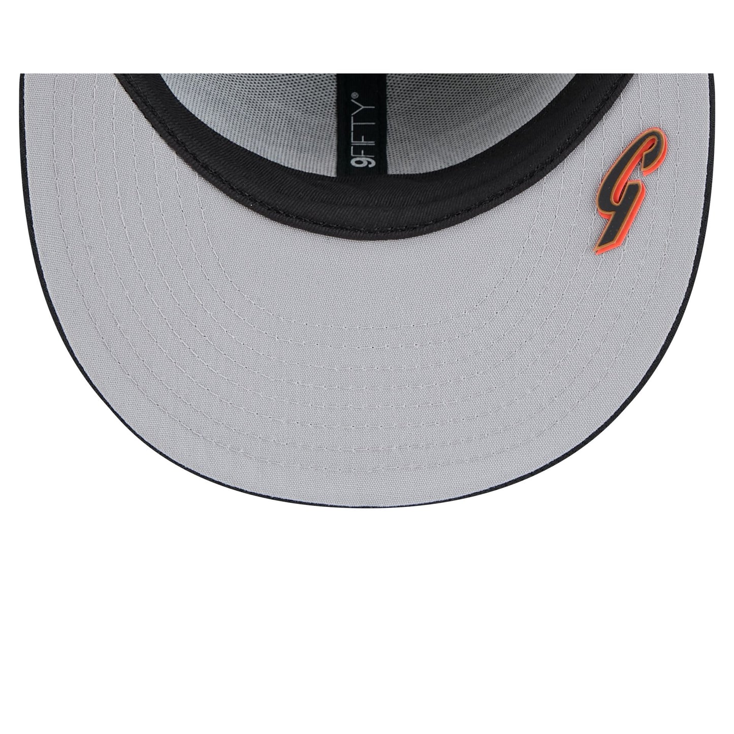 The San Francisco Giants 2025 Clubhouse Alt 9FIFTY Snapback features an embroidered Giants alternate logo at the front panels with a dashmark mesh fabrication throughout. Additional details include a snapback closure at the rear and a silicone logo on a gray undervisor.
