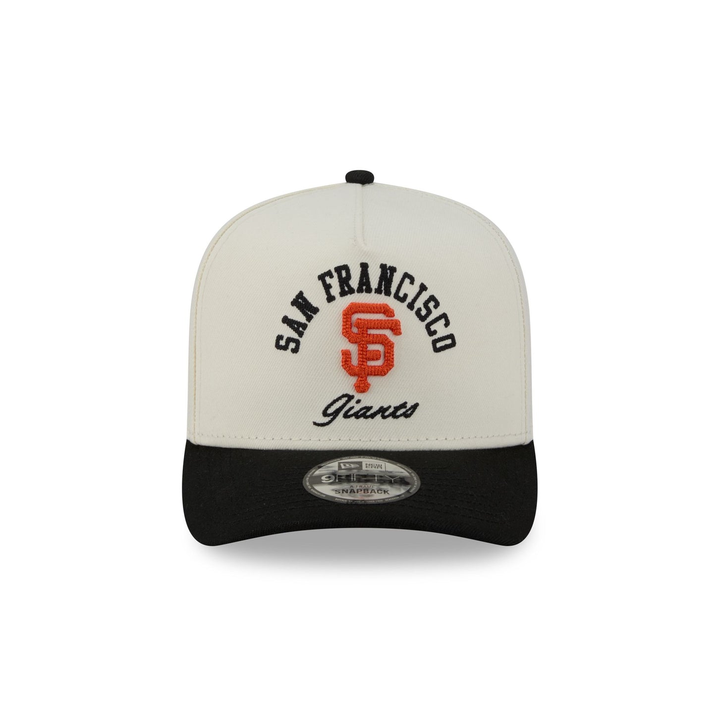 The San Francisco Giants Arched Chrome White 9FIFTY A-Frame Snapback features an embroidered Giants arched graphic at the front panels with a logo at the right-wear side. Additional details include the establishment year above an adjustable snapback closure at the rear and a gray undervisor.