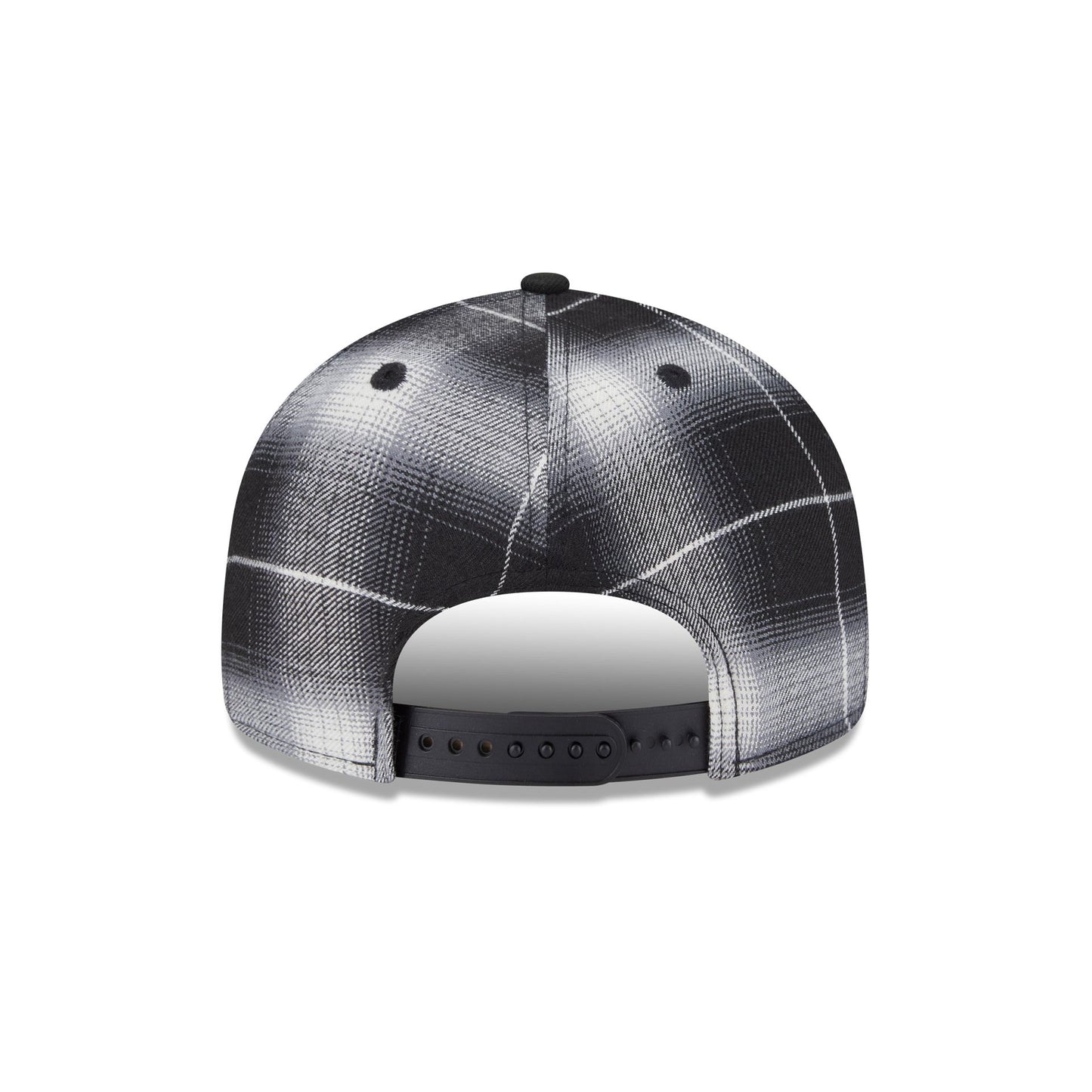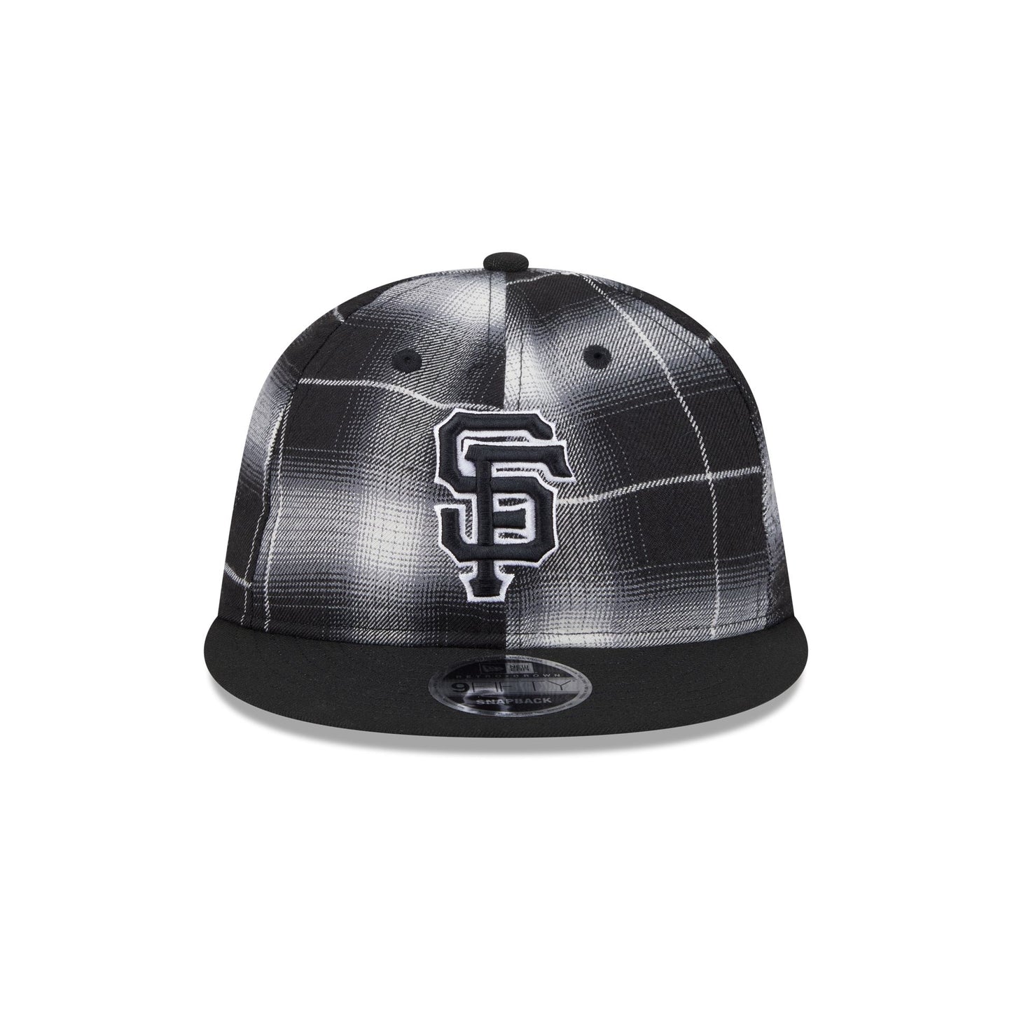 The San Francisco Giants Black and White Plaid Retro Crown 9FIFTY Snapback features an embroidered Giants logo at the front panels with a black visor, a gray undervisor, and a snapback closure at the rear.