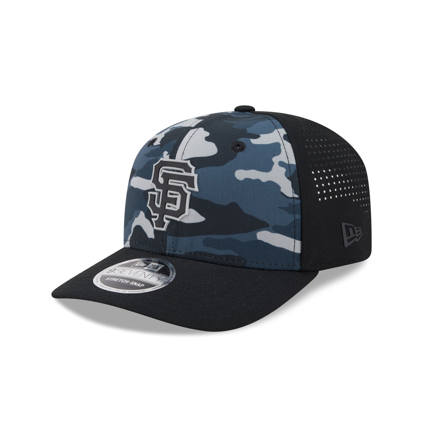 The San Francisco Giants Black Camo Performance 9SEVENTY Stretch-Snap features a silicone Giants logo at the front panels against a camo print pattern with a performance fabric throughout. Additional details include a silicone team wordmark at the right-wear side, an adjustable stretch-snap closure at a performance mesh rear, and a gray undervisor.