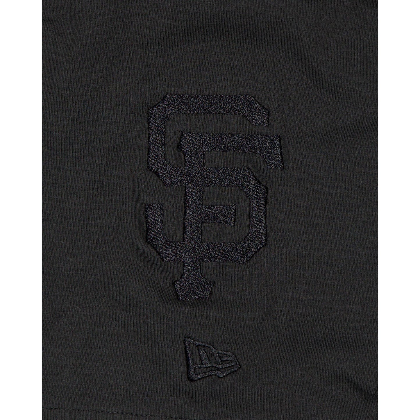 The San Francisco Giants Black on Black Logo Select T-Shirt features a satin applique with a tonal stitch Giants wordmark at the chest and an embroidered team logo at the left-wear sleeve.