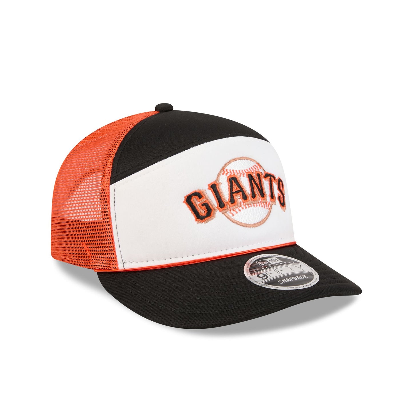 The San Francisco Giants Blocked Split Panel 9FIFTY Trucker features an embroidered Giants logo at the front panel with a split-crown construction. Additional details include an adjustable snapback closure at a mesh rear and a gray undervisor.
