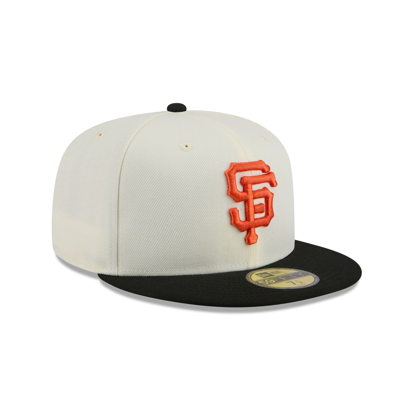 The San Francisco Giants Chrome 59FIFTY Fitted Cap features an embroidered Giants logo at the front panels with a matching MLB Batterman logo at the rear, a black visor, and a gray undervisor.