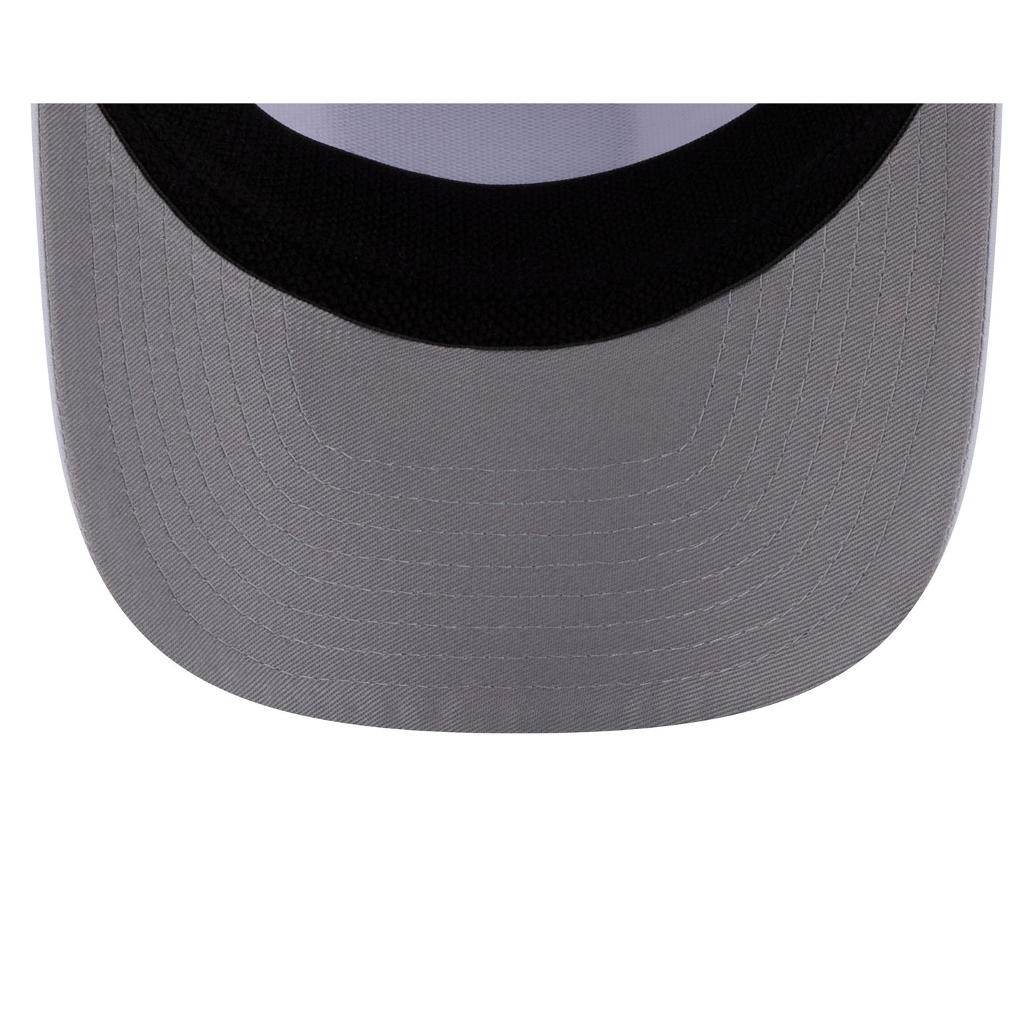 The San Francisco Giants Circle Logo White Split Panel 9SEVENTY Stretch-Snap features a woven silicone Giants circle logo at the front panel with a split crown construction and light-weight fabrication. Additional details include an adjustable stretch-snap closure at the rear and a gray undervisor.