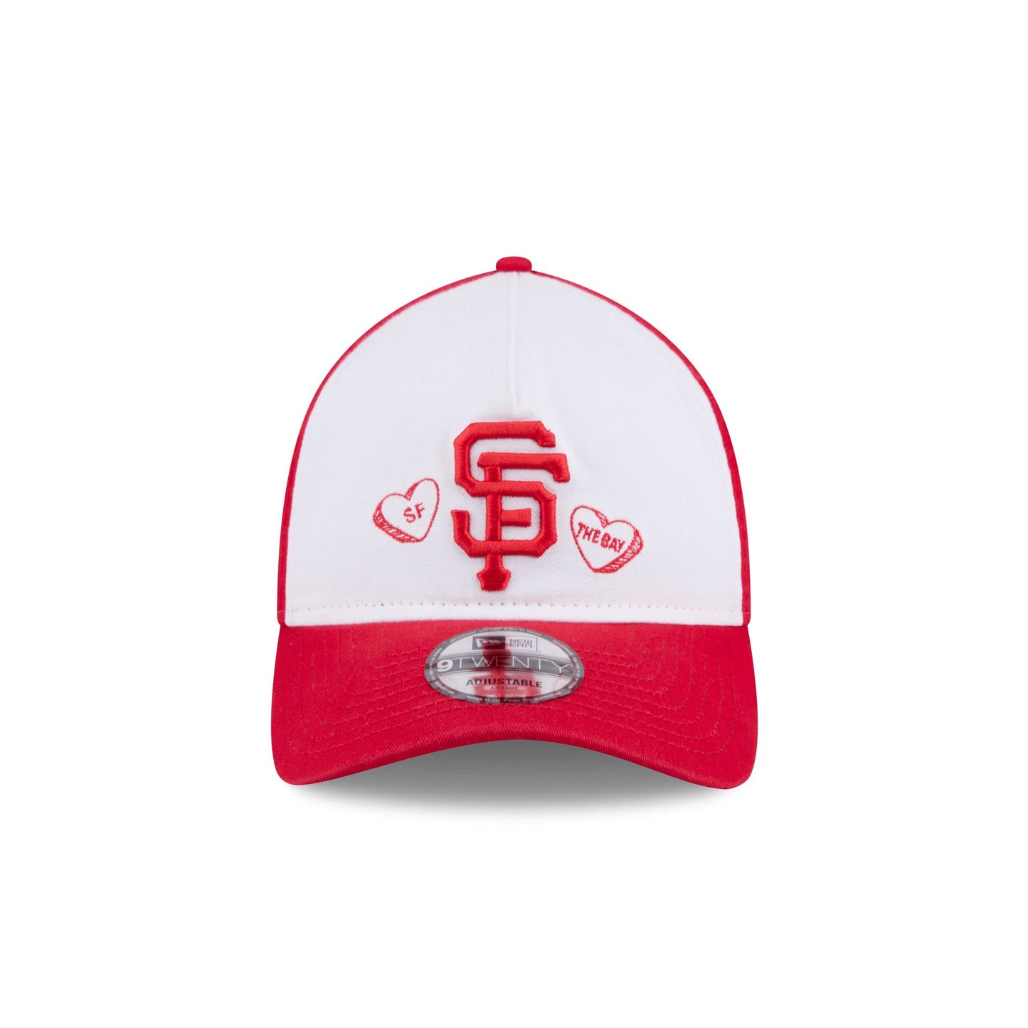 The San Francisco Giants Conversation Hearts 9TWENTY A-Frame Adjustable Cap features an embroidered Giants logo with conversation hearts at the front panels. Additional details include an adjustable D-Ring closure at the rear and a pink undervisor.