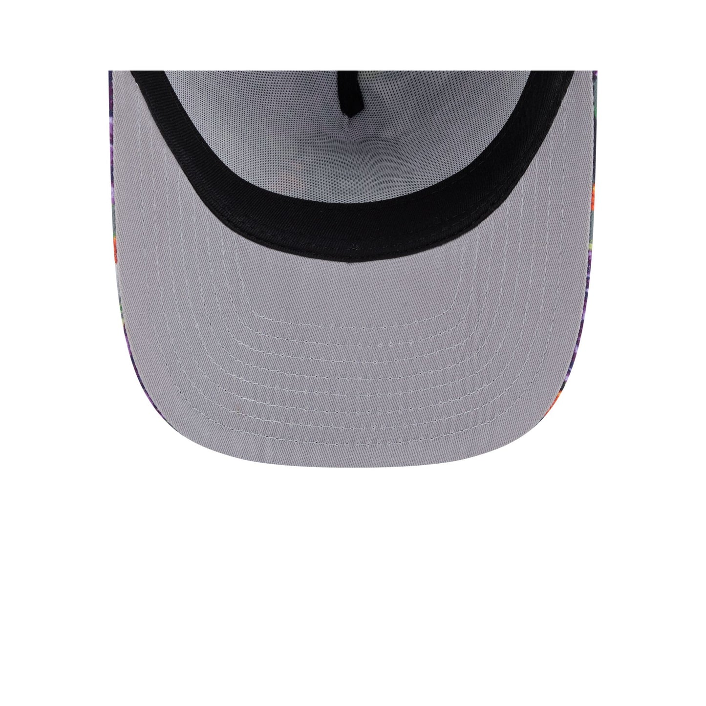 The San Francisco Giants Day of the Dead Skull & Roses 9FIFTY A-Frame Snapback features an embroidered Giants logo at the front panels with a skull and purple roses print throughout. Additional details include an adjustable snapback closure at the rear and a gray undervisor.
