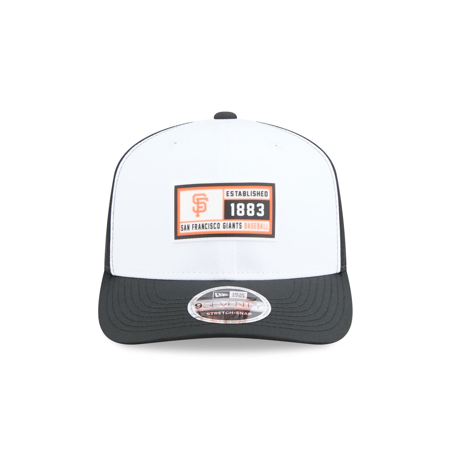 The San Francisco Giants Est. Patch 9SEVENTY Stretch-Snap features a woven silicone Giants establishment patch at the front panels with a slant-snap closure at a performance mesh rear and a gray undervisor.