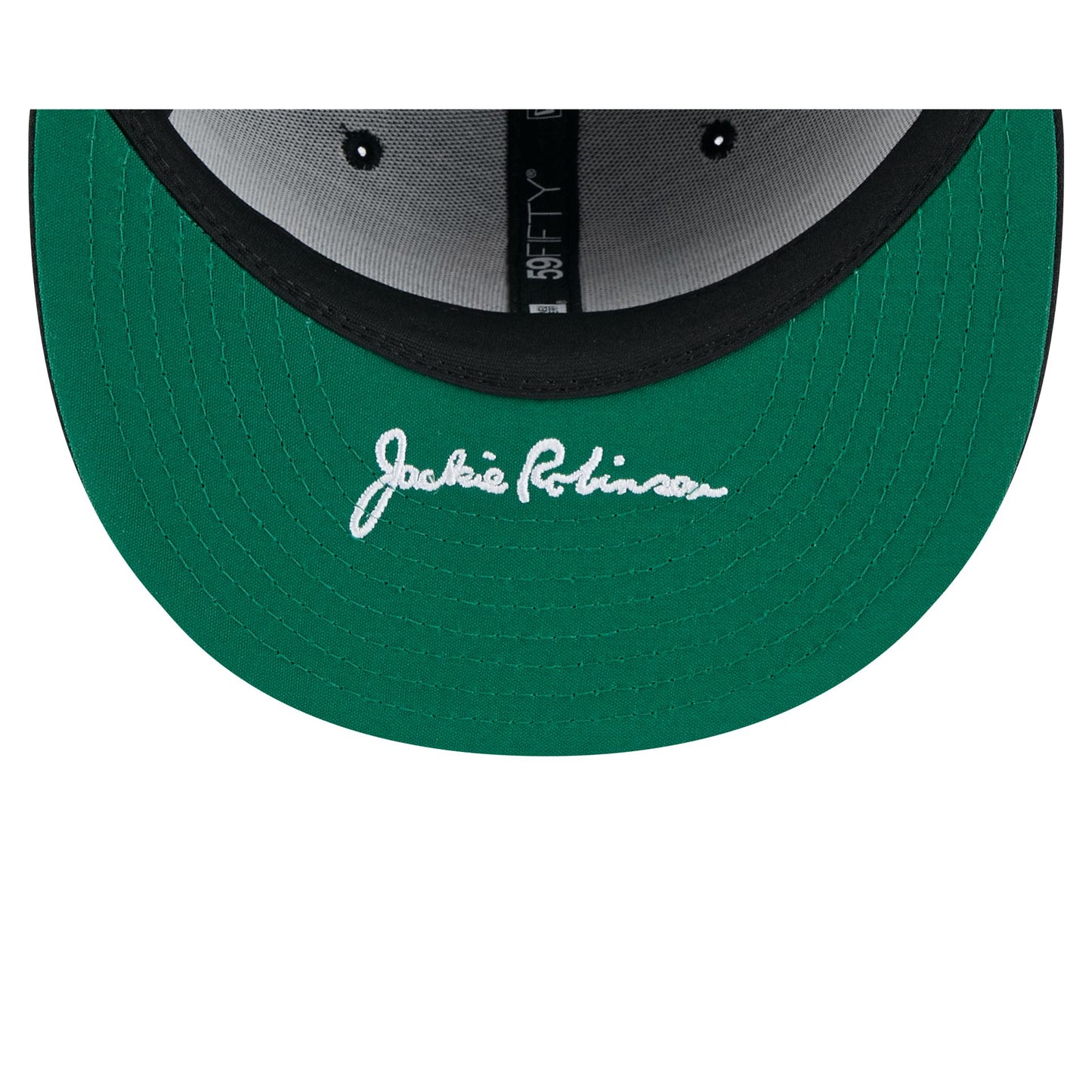 The San Francisco Giants Jackie Robinson Day 2025 59FIFTY Fitted Cap features an embroidered Giants logo at the front panels with an MLB Batterman logo at the rear. Additional details include a Jackie Robinson Breaking Barriers patch at the right-wear side and Robinson's embroidered signature on a green undervisor.
