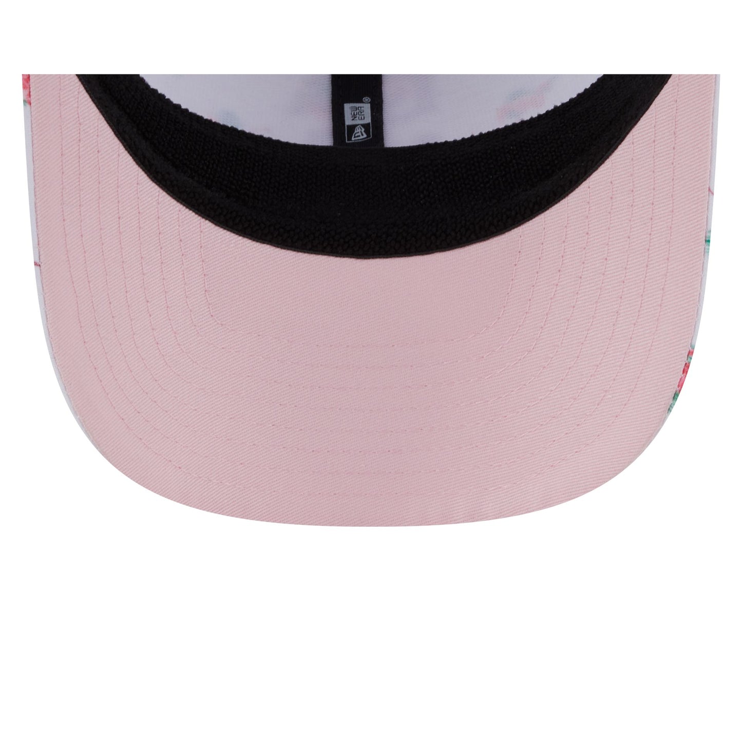 The San Francisco Giants Pattern 9SEVENTY Trucker Hat features an allover flamingo print with an embroidered Giants logo at the front panels with an adjustable snapback closure at a mesh rear.