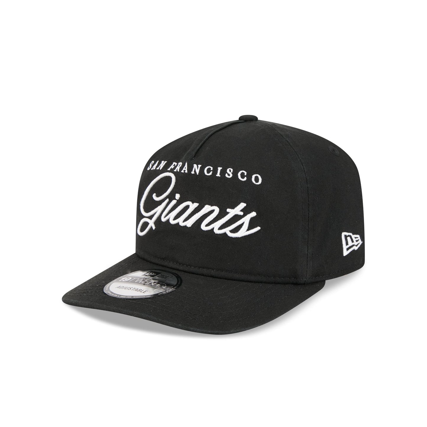 The San Francisco Giants Scripted 19TWENTY Adjustable Cap features an embroidered Giants script wordmark at the front panels with a team logo at the right-wear side. Additional details include an adjustable snapback closure at the rear and a gray undervisor.