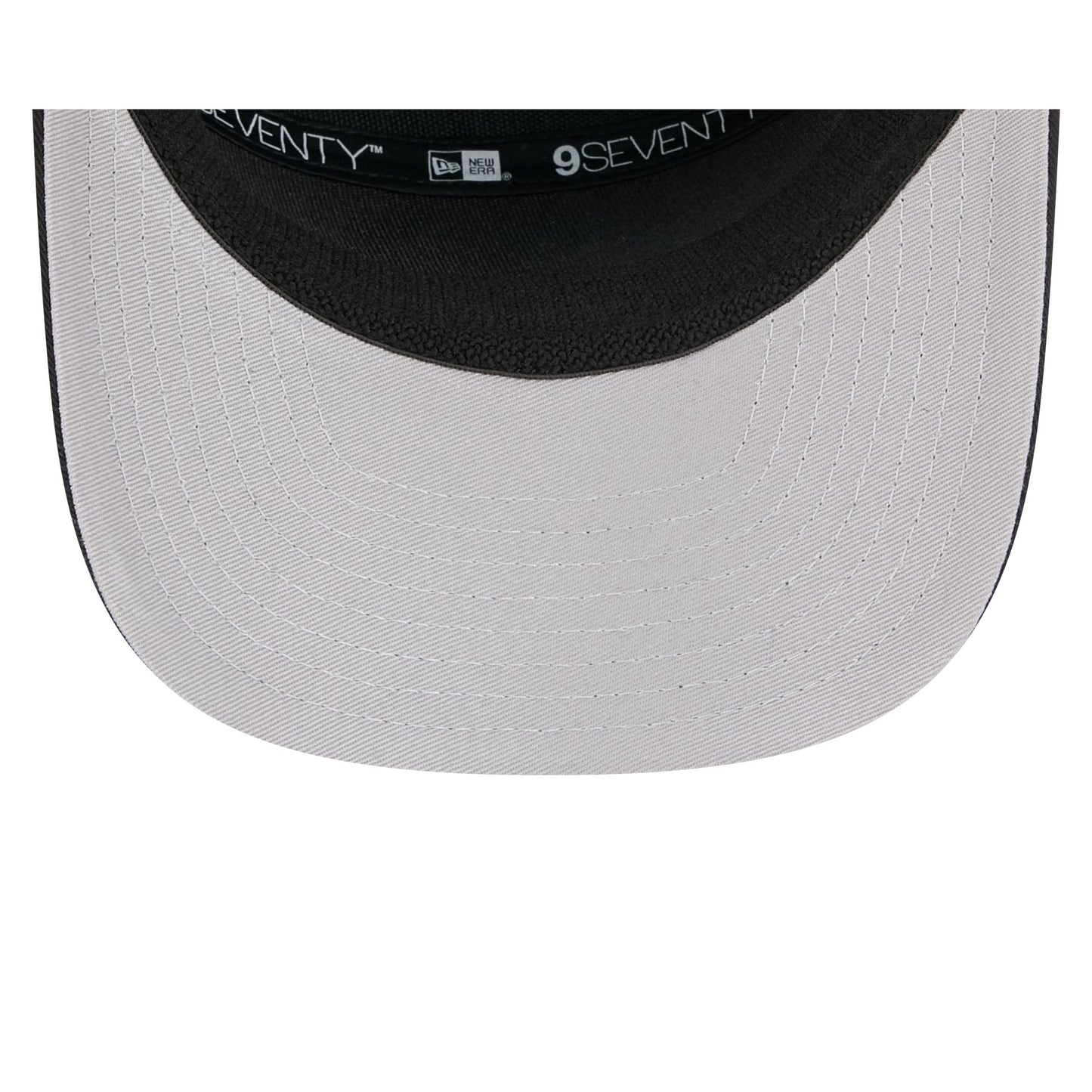 The San Francisco Giants Split Panel 9SEVENTY Stretch-Snap features an embroidered Giants logo at the front panel with a split crown construction and a rope at the visor. Additional details include an adjustable stretch-snap closure at the rear and a gray undervisor.