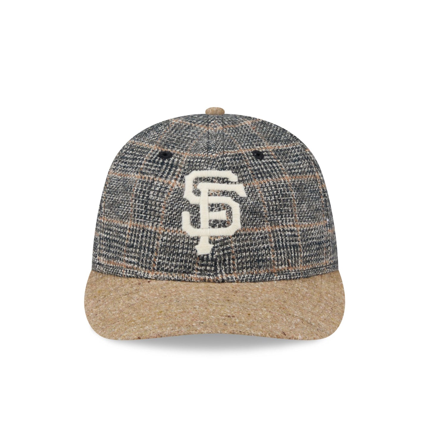 The San Francisco Giants Three Looms Vintage Tweed Retro Crown Pre-Curved 59FIFTY Fitted features an embroidered Giants logo at the front panels with a matching MLB Batterman logo at the rear, a pre-curved tan visor, and a gray undervisor.