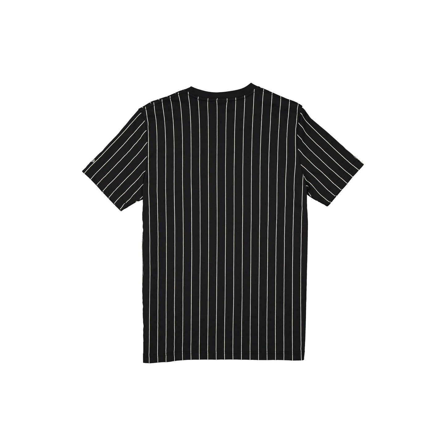 The San Francisco Giants Throwback Pinstripe Wordmark T-Shirt features a twill applique Giants wordmark and logo at the front with a New Era jock tag at the left hip.