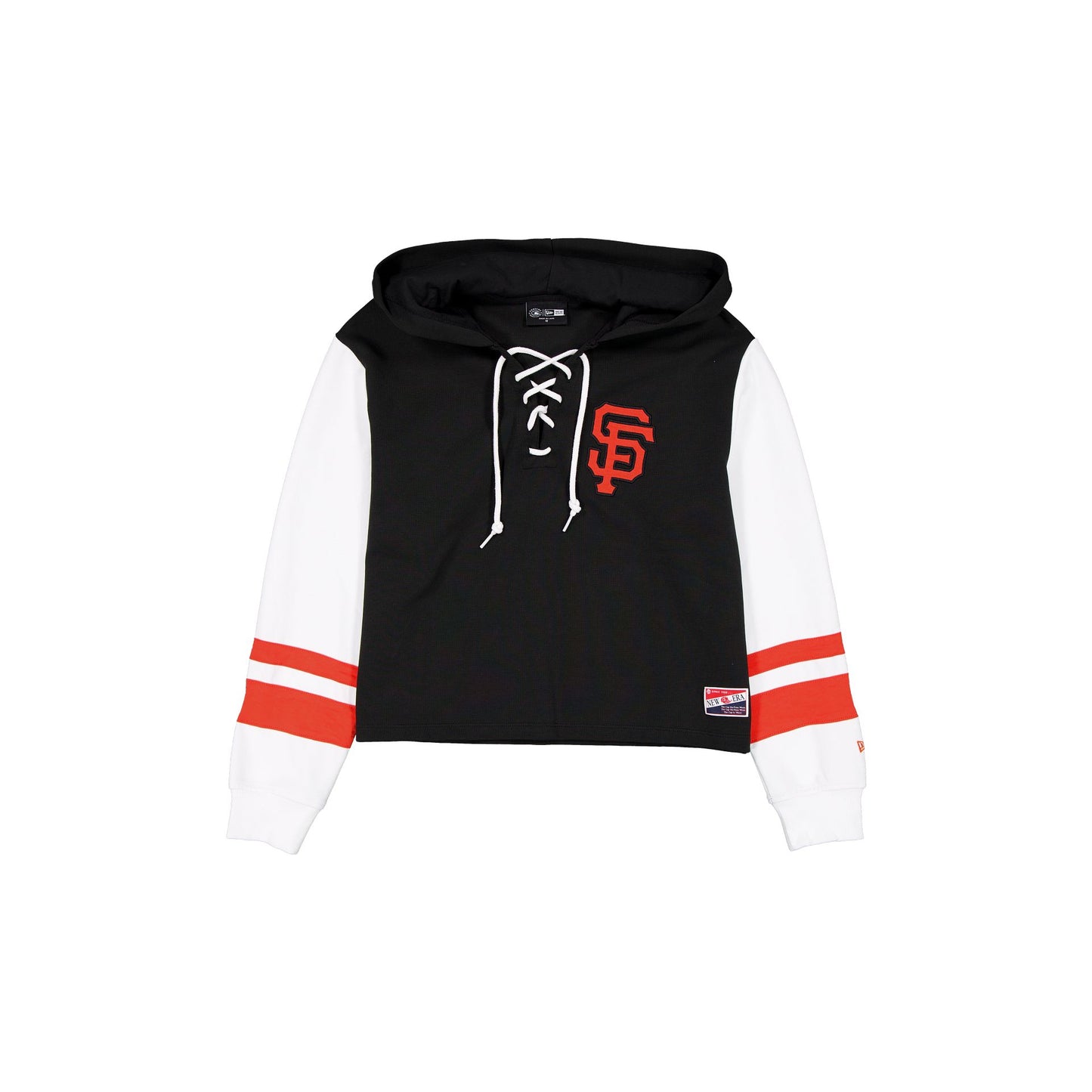 The San Francisco Giants Throwback Tie Women's Hoodie features an embroidered Giants logo at the left chest with a V-neck tie and a woven New Era jock tag at the left hip.