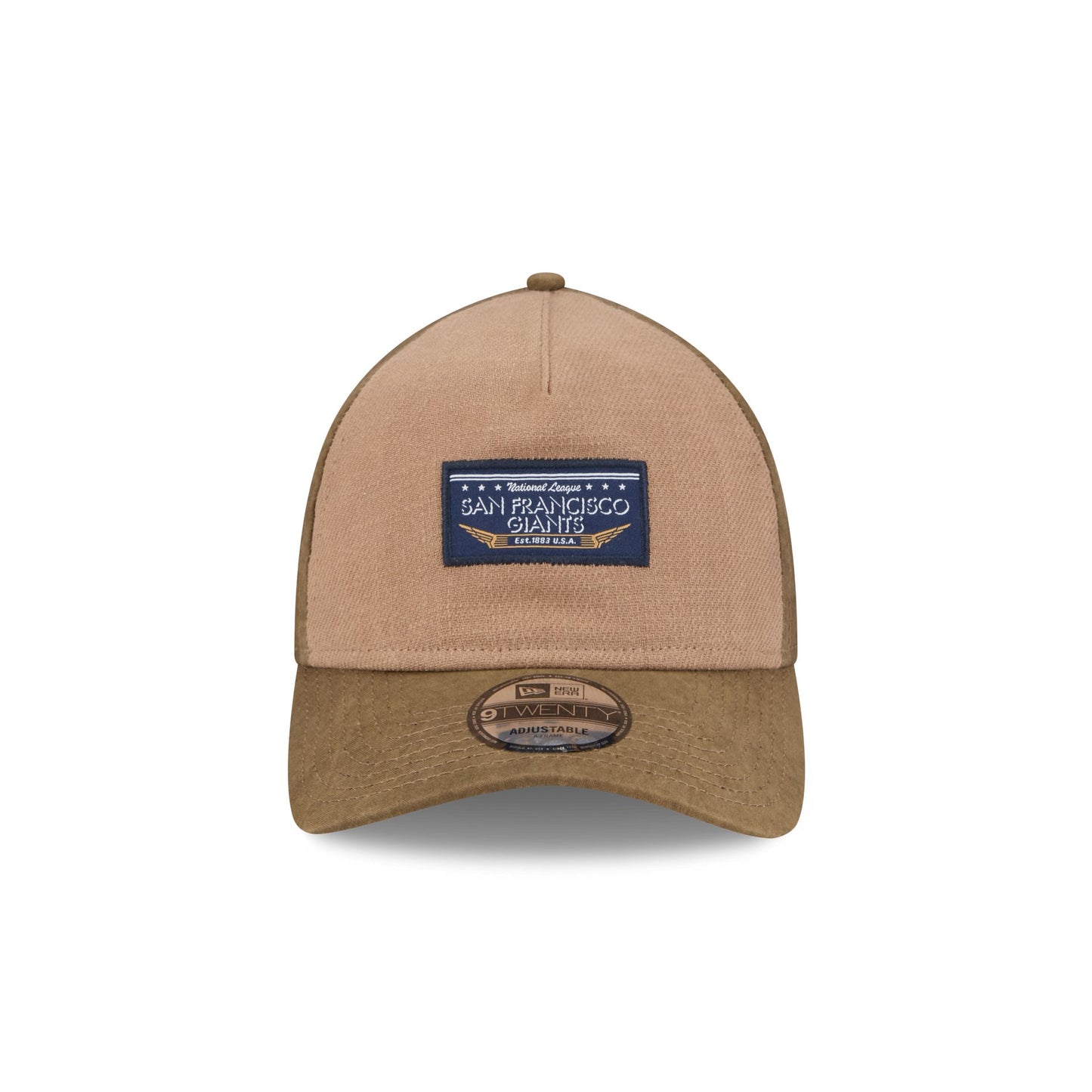 The San Francisco Giants Utility Linen 9TWENTY A-Frame Adjustable Cap features a woven Giants tag at the front panels against a linen fabrication with a team logo at the right-wear side. Additional details include the state or city flag sublimation at the interior of the cap and an adjustable D-Ring closure at the rear.