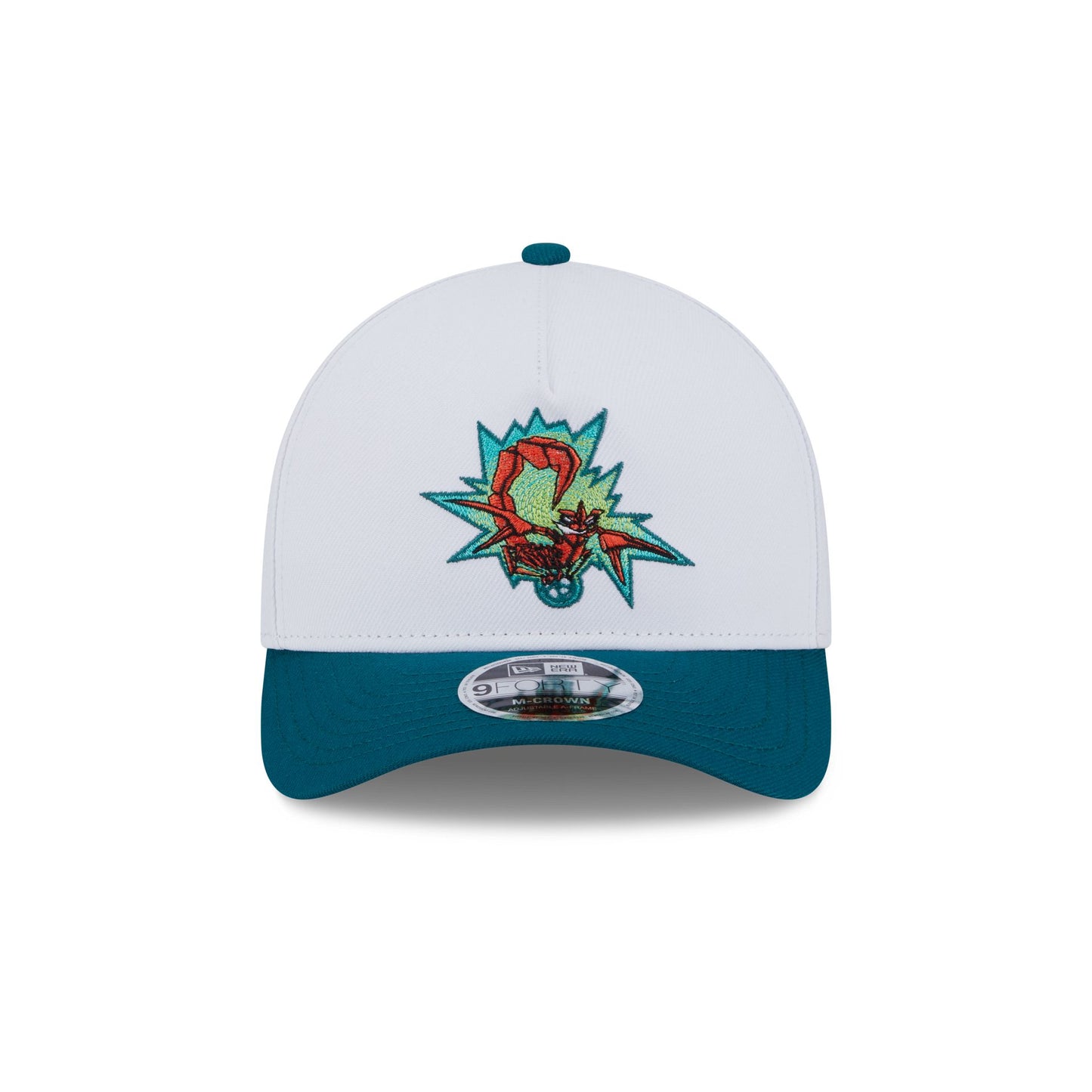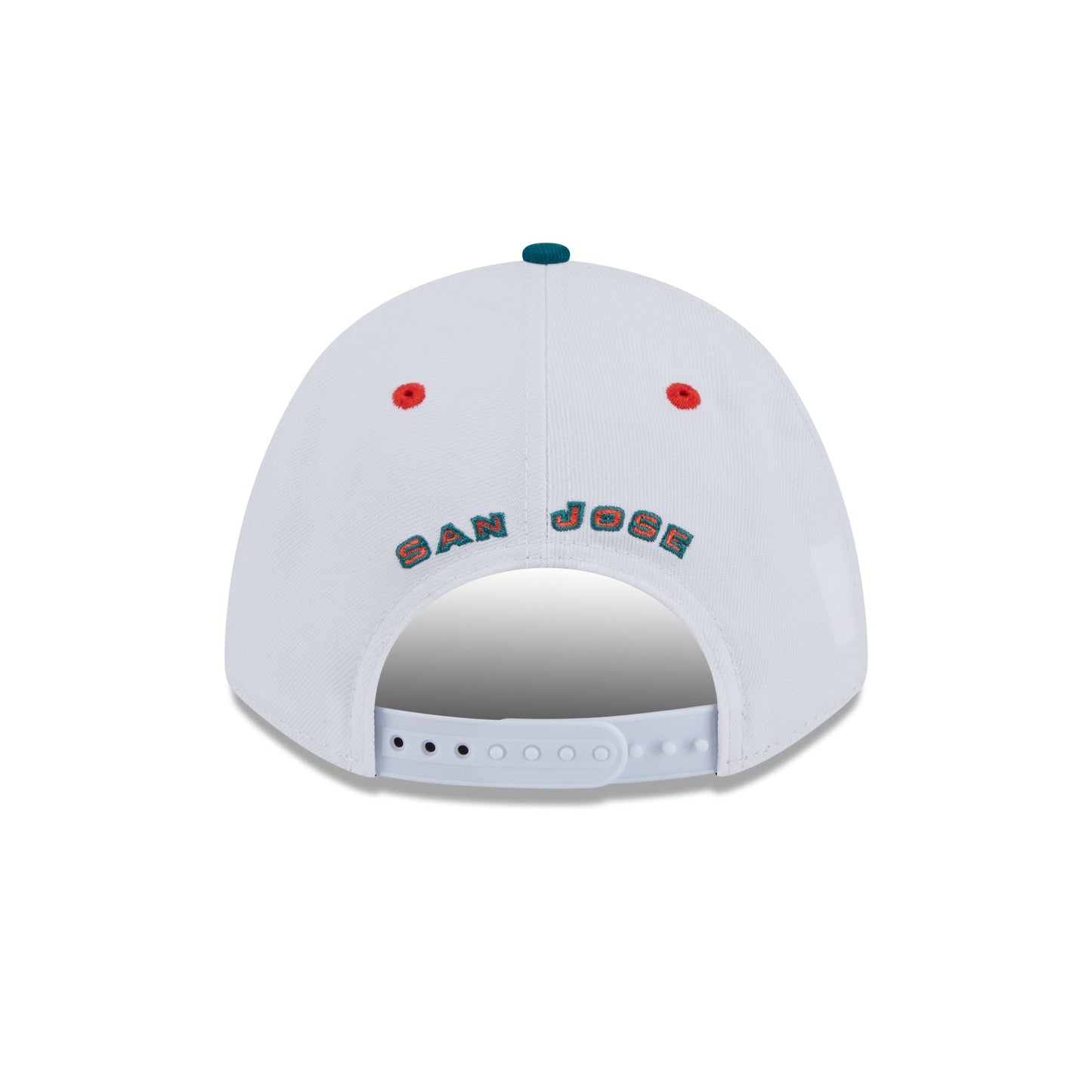 The San Jose Earthquakes 2025 Jersey Hook White 9FORTY M-Crown A-Frame Snapback features an embroidered Earthquakes retro Clash logo at the front panels with a team patch at the right-wear side. Additional details include a team wordmark above a snapback closure at the rear and a multicolor undervisor.