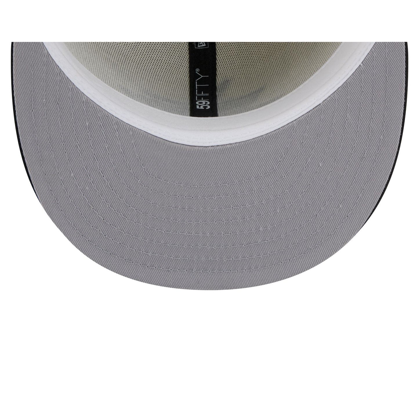 The San Jose Sharks Chrome White 59FIFTY Fitted Cap features an embroidered Sharks logo at the front panels with a matching NHL Shield at the rear and a gray undervisor.
