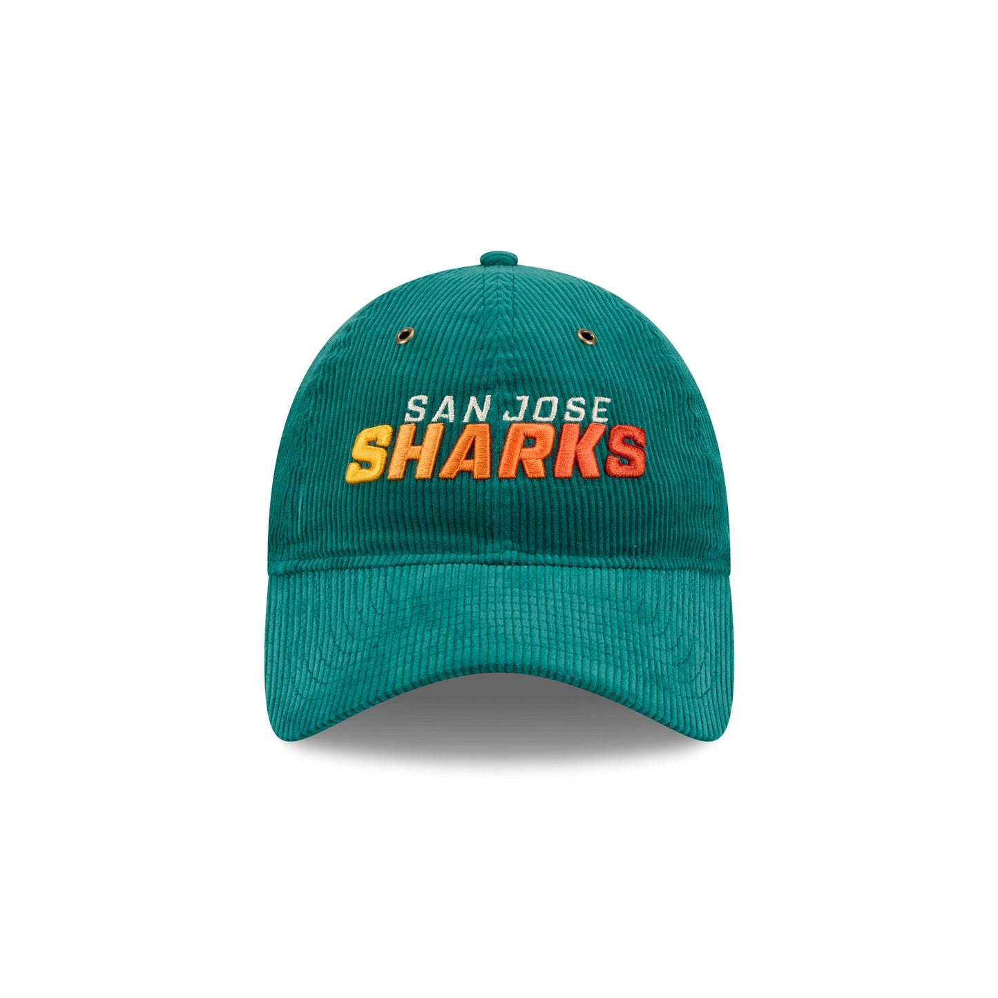 The San Jose Sharks Gradient Corduroy 9TWENTY Adjustable Cap features an embroidered Sharks gradient wordmark at the front panels against a green corduroy fabrication. Additional details include eyelets at the crown and an adjustable clasp closure at the rear.