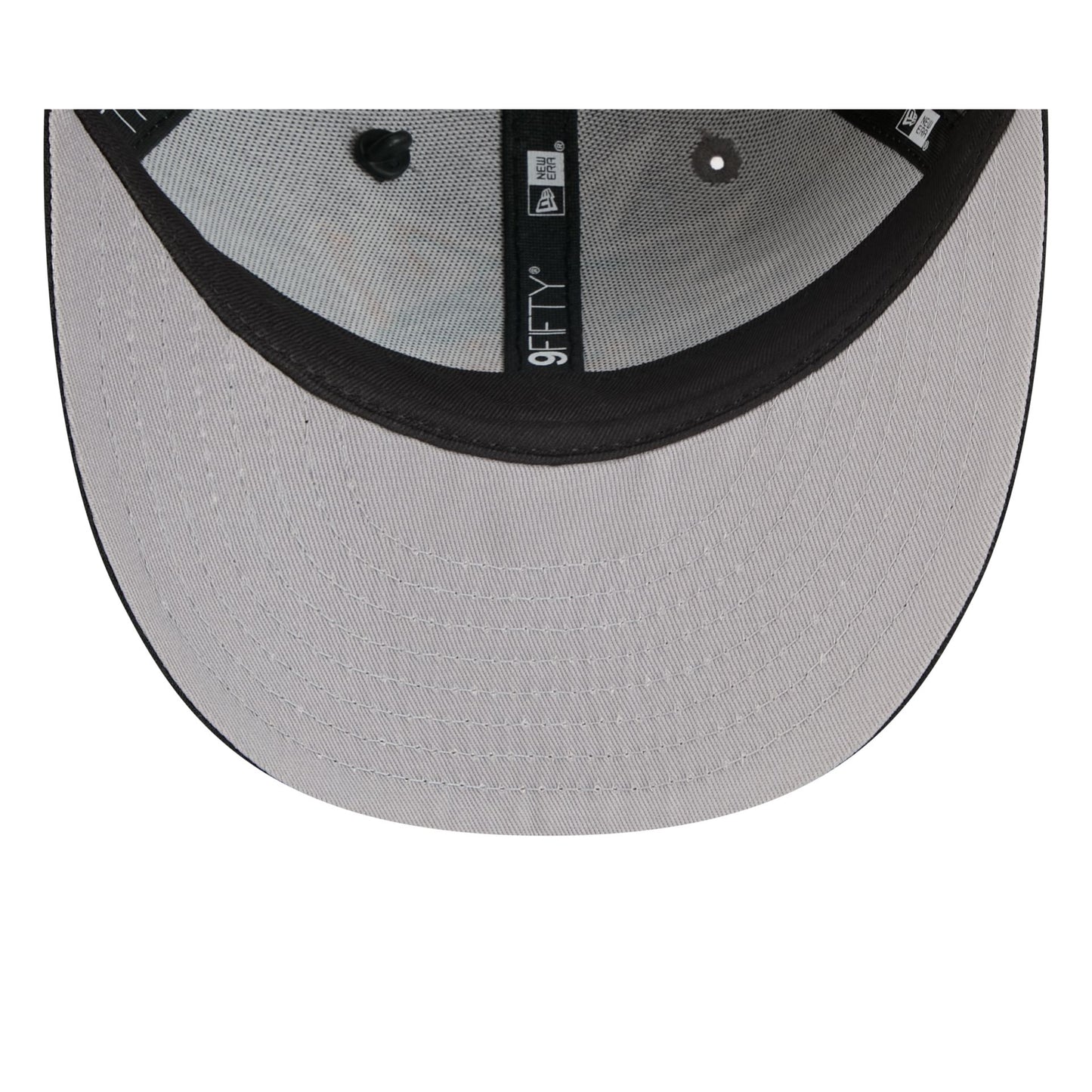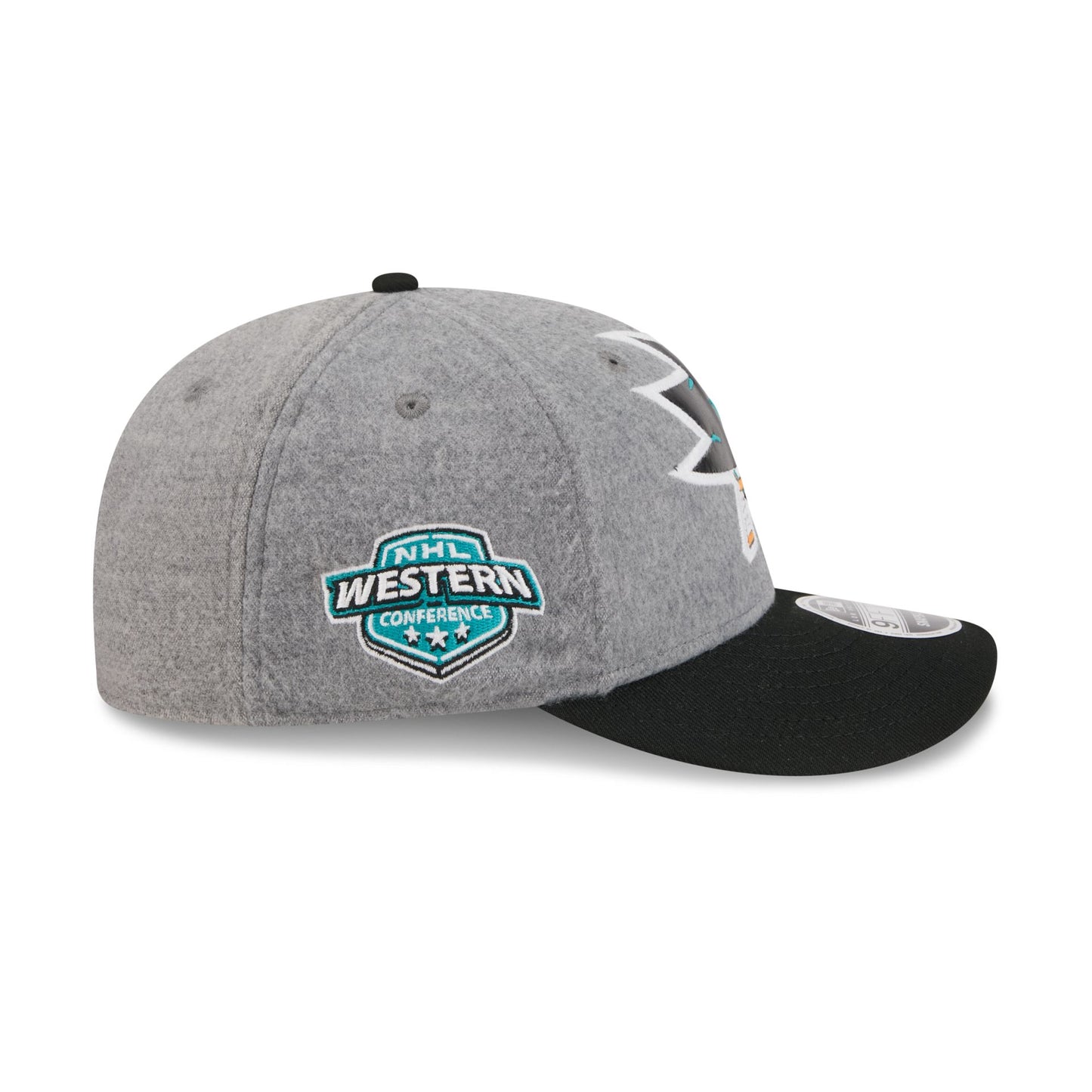 The San Jose Sharks Heather Gray Wool Low Profile 9FIFTY snapback features a faux leather applique Sharks logo at the front panels against a wool fabrication throughout the cap. Additional details include a conference patch at the right-wear side, an NHL pin at the front, and a script wordmark above an adjustable snapback closure at the rear.