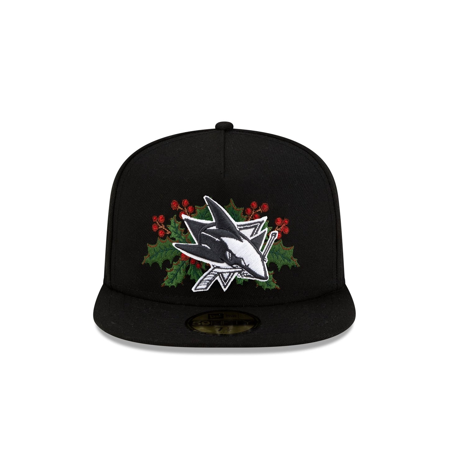 The San Jose Sharks Holly 59FIFTY A-Frame Fitted Cap features an embroidered Sharks black and white logo with holly at the front panels with a matching NHL Shield logo at the rear. Additional details include a holly New Era Flag at the left-wear side and a black undervisor.