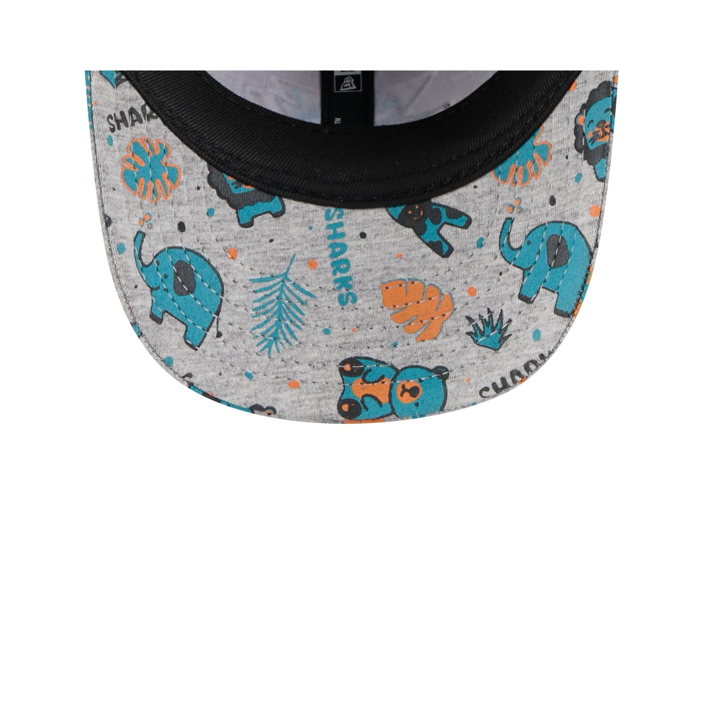 The San Jose Sharks Kids Animal 9TWENTY Adjustable Cap features an embroidered Sharks logo at the front panels with screen-printed animals throughout and a soft stretch cord at the rear.