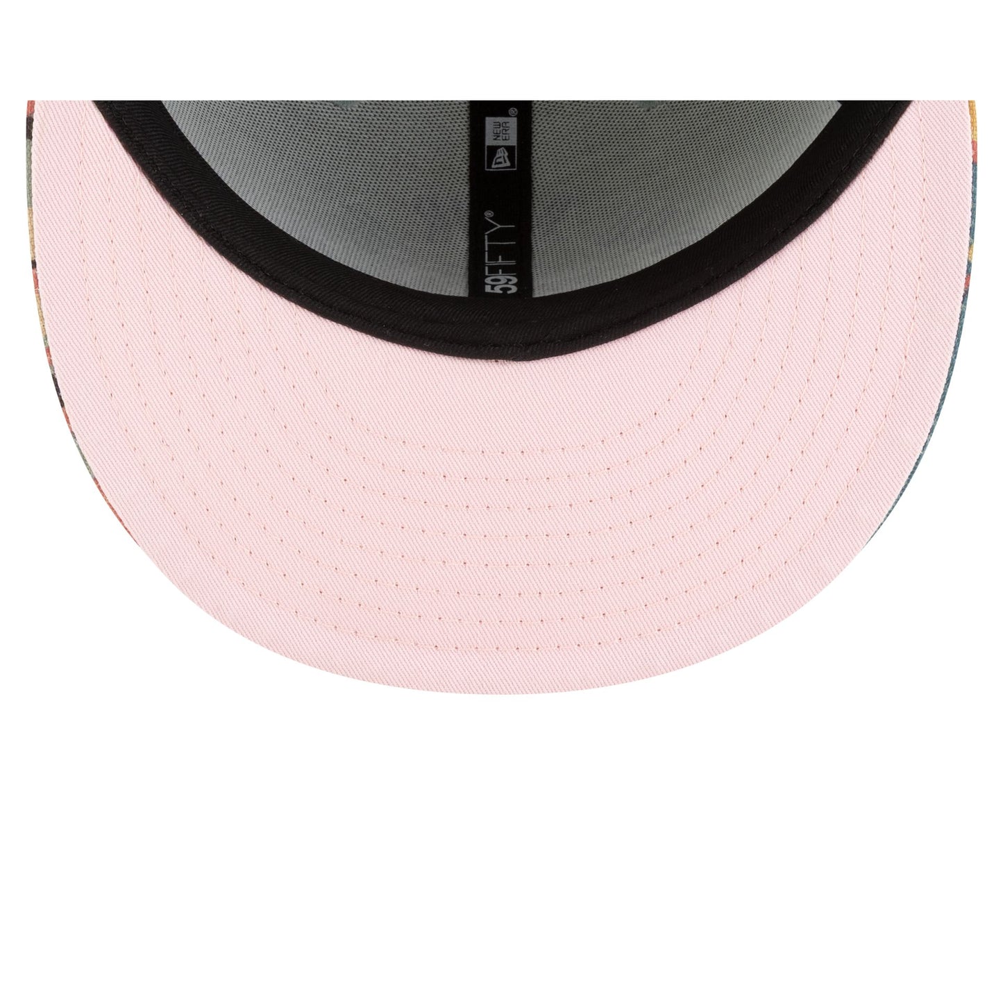 The San Jose Sharks Retro Everest Camo 59FIFTY Fitted Cap features an embroidered Sharks logo at the front panels with a team patch at the right-wear side and the NHL Shield at the rear. Additional details include a camo visor and a pink undervisor.
