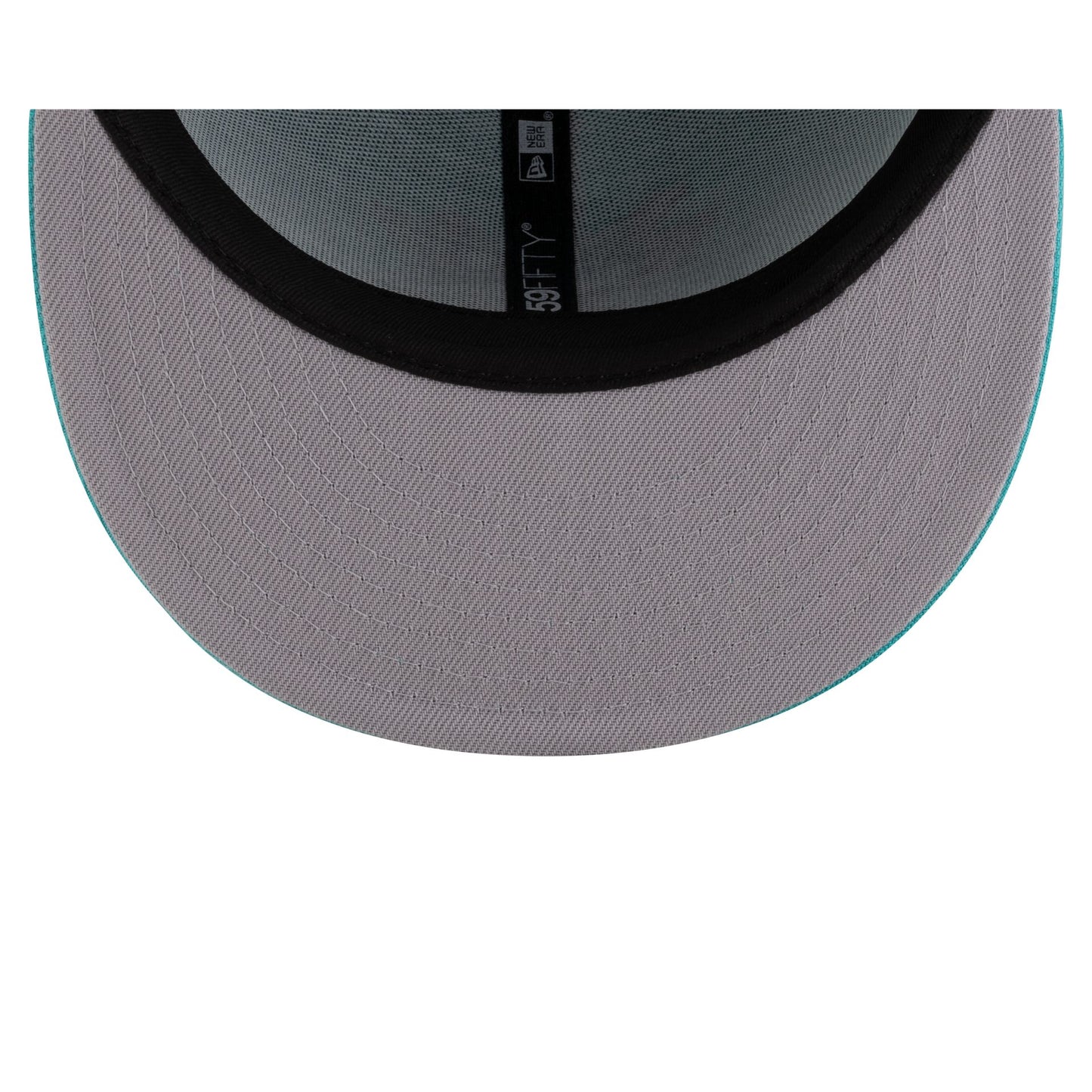 The San Jose Sharks Teal 59FIFTY Fitted Cap features an embroidered Sharks logo at the front panels with a matching NHL Shield at the rear. Additional details include a 30th Anniversary patch at the right-wear side and a gray undervisor.