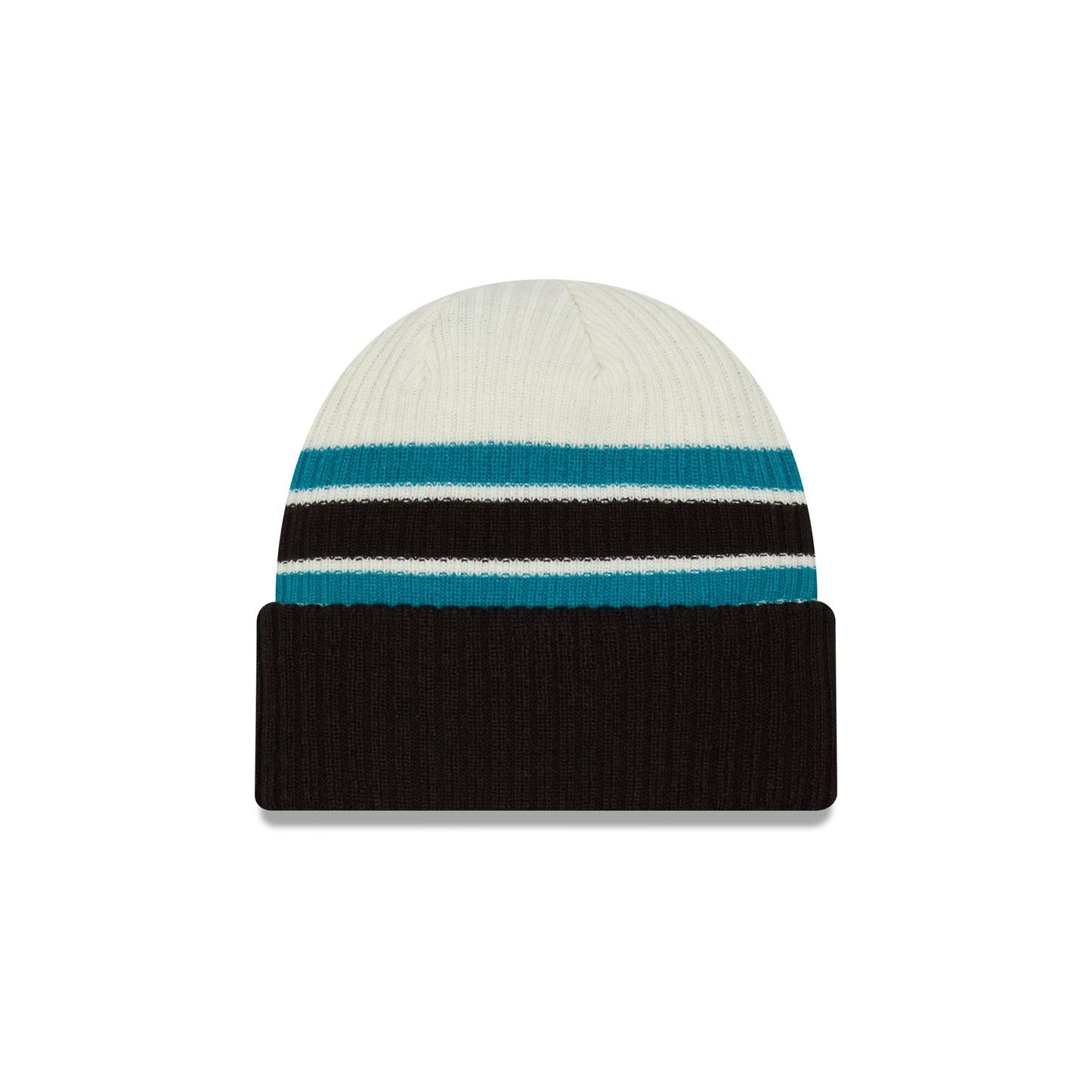 The San Jose Sharks Vintage Ribbed Beanie features an embroidered Sharks logo at the front cuff and stripes at the crown.