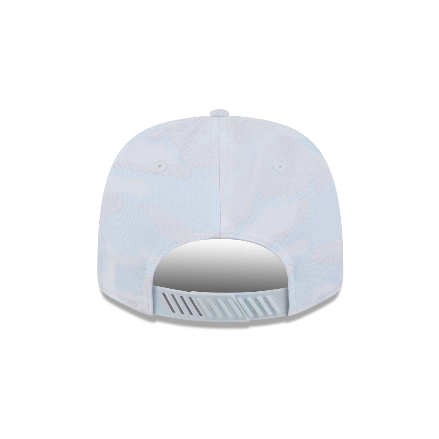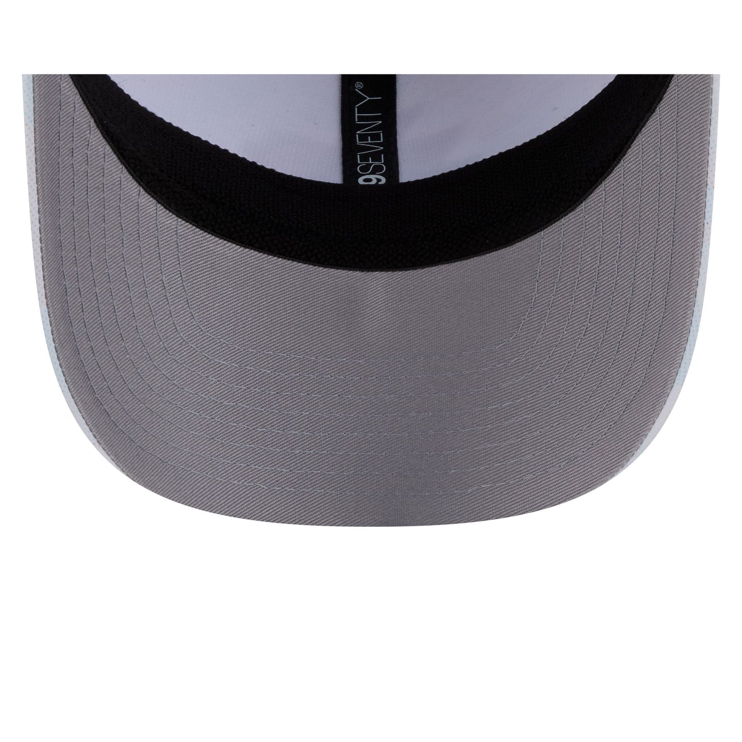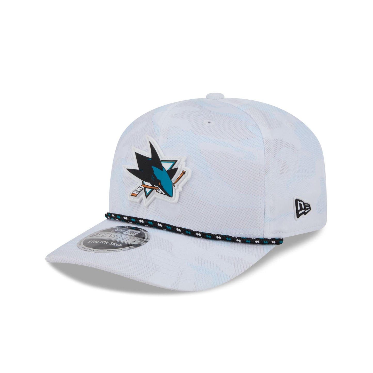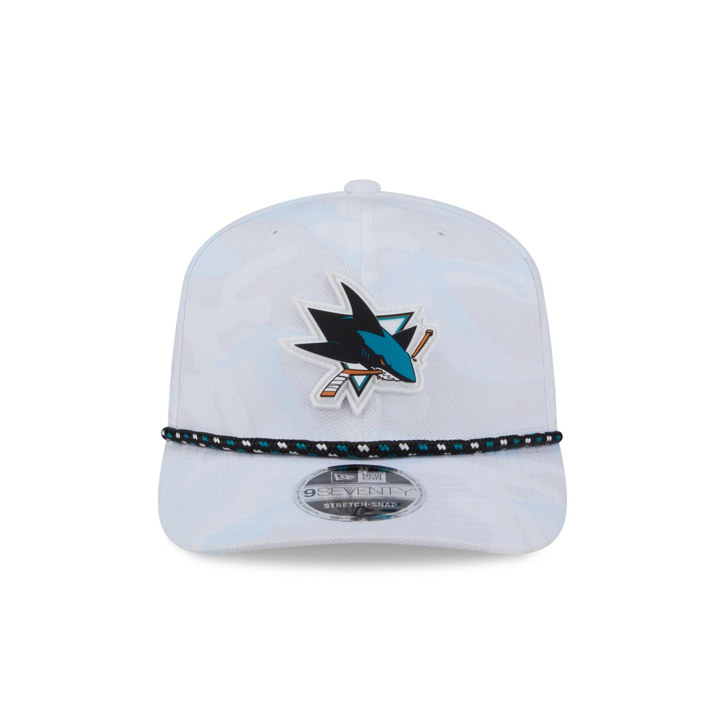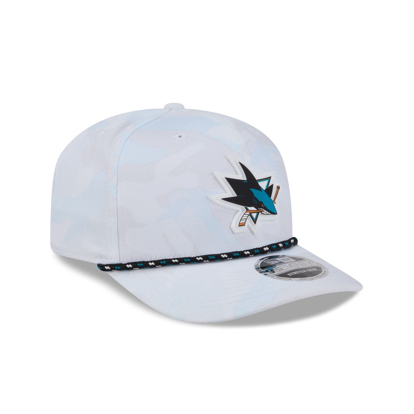 The San Jose Sharks White Camo Performance Rope 9SEVENTY Stretch-Snap features a silicone Sharks logo at the front panels against a camo print performance fabrication. Additional details include a rope at the visor, an adjustable stretch-snap closure at the rear and a gray undervisor.