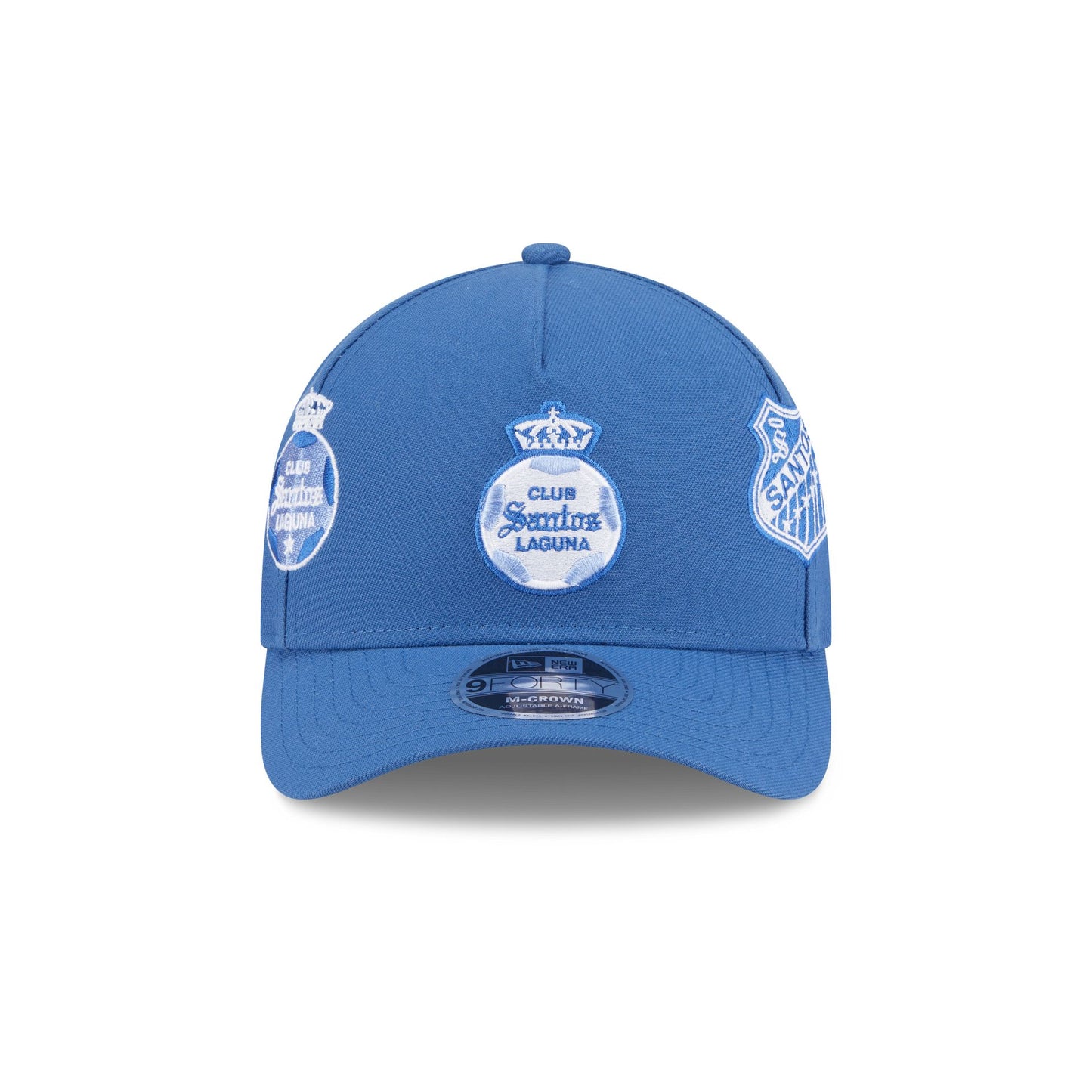 The Santos Laguna Indigo 9FORTY M-Crown A-Frame Trucker features the Santos primary logo embroidered at the front panel with alternate team logos throughout the crown, a team wordmark above a snapback closure at the rear, and a gray undervisor.