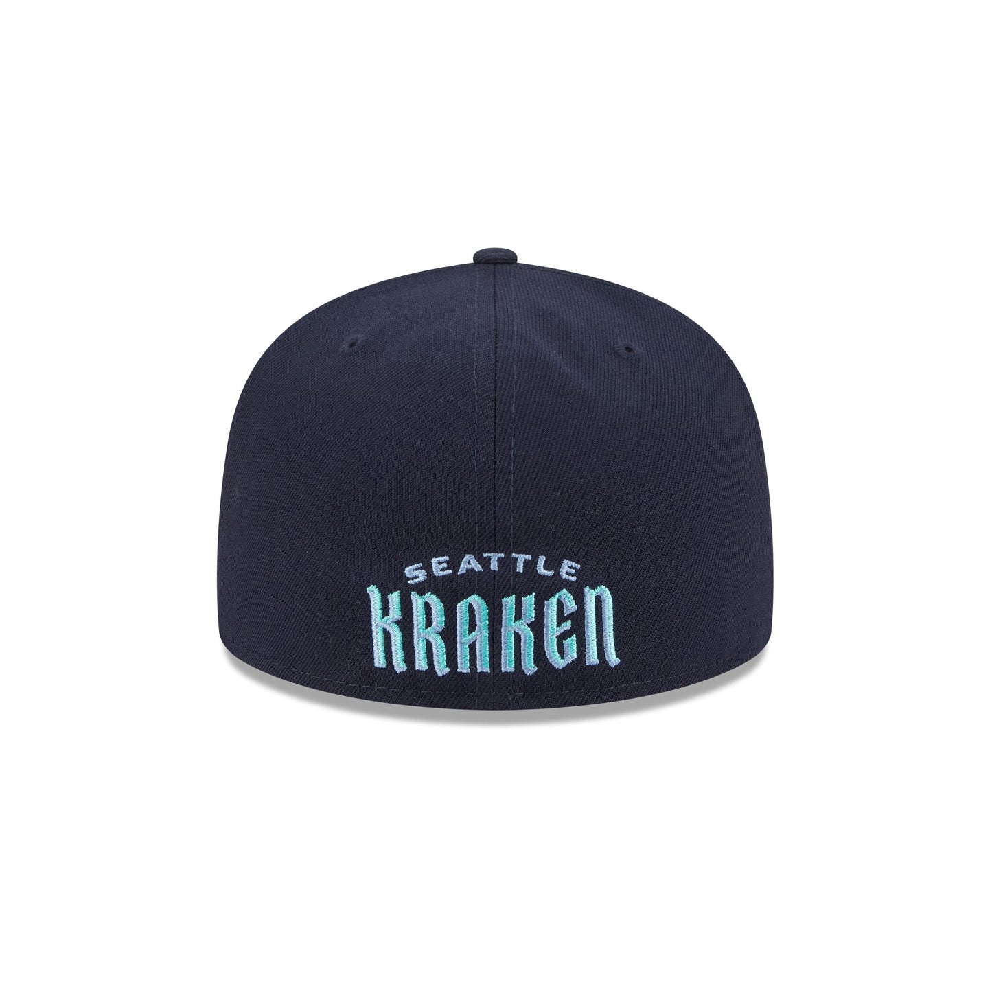 The Seattle Kraken Deceptor 59FIFTY Fitted Cap features an embroidered Kraken deceptive logo at the front panels with a team logo at the right-wear side. Additional details include a wordmark at the rear, and a gray undervisor.