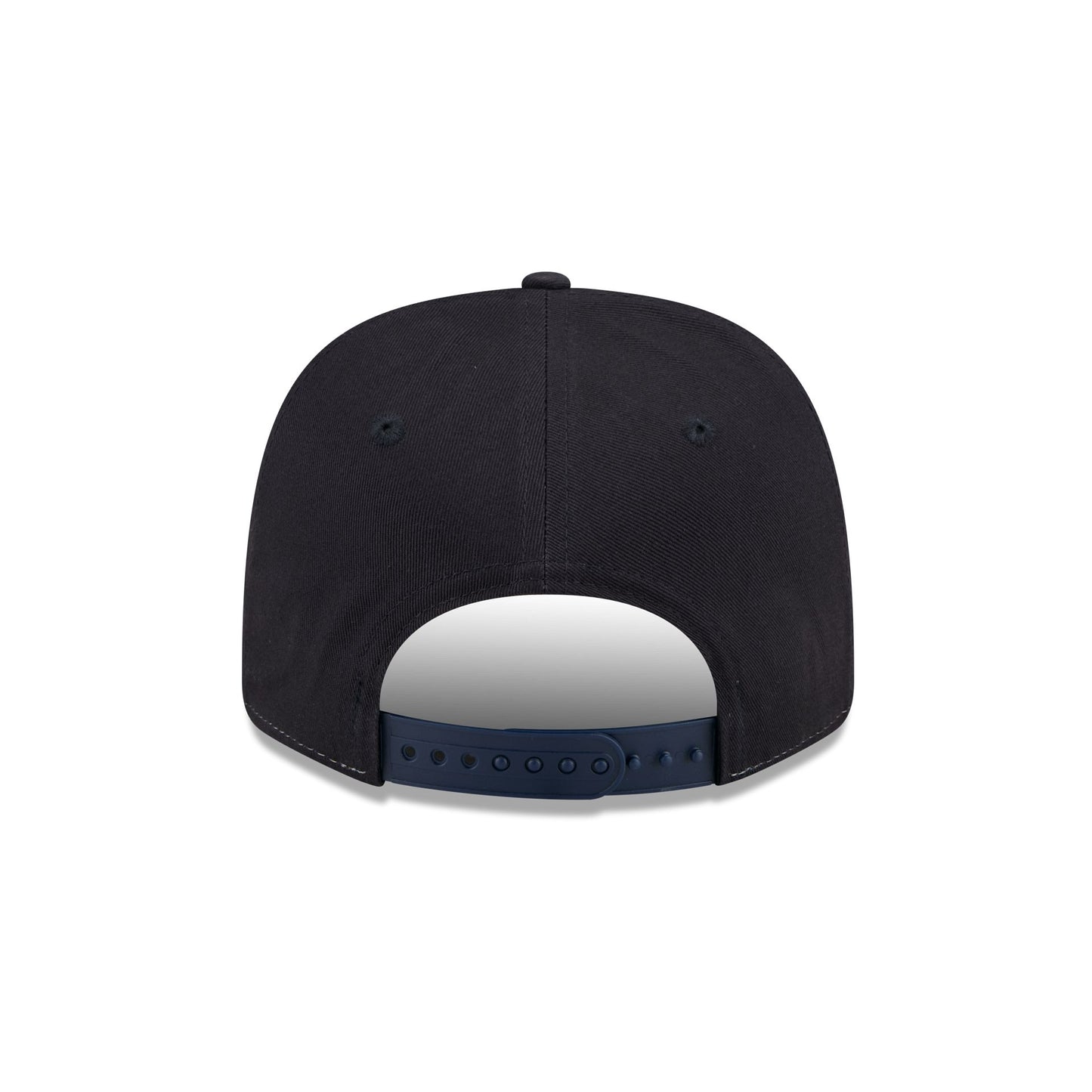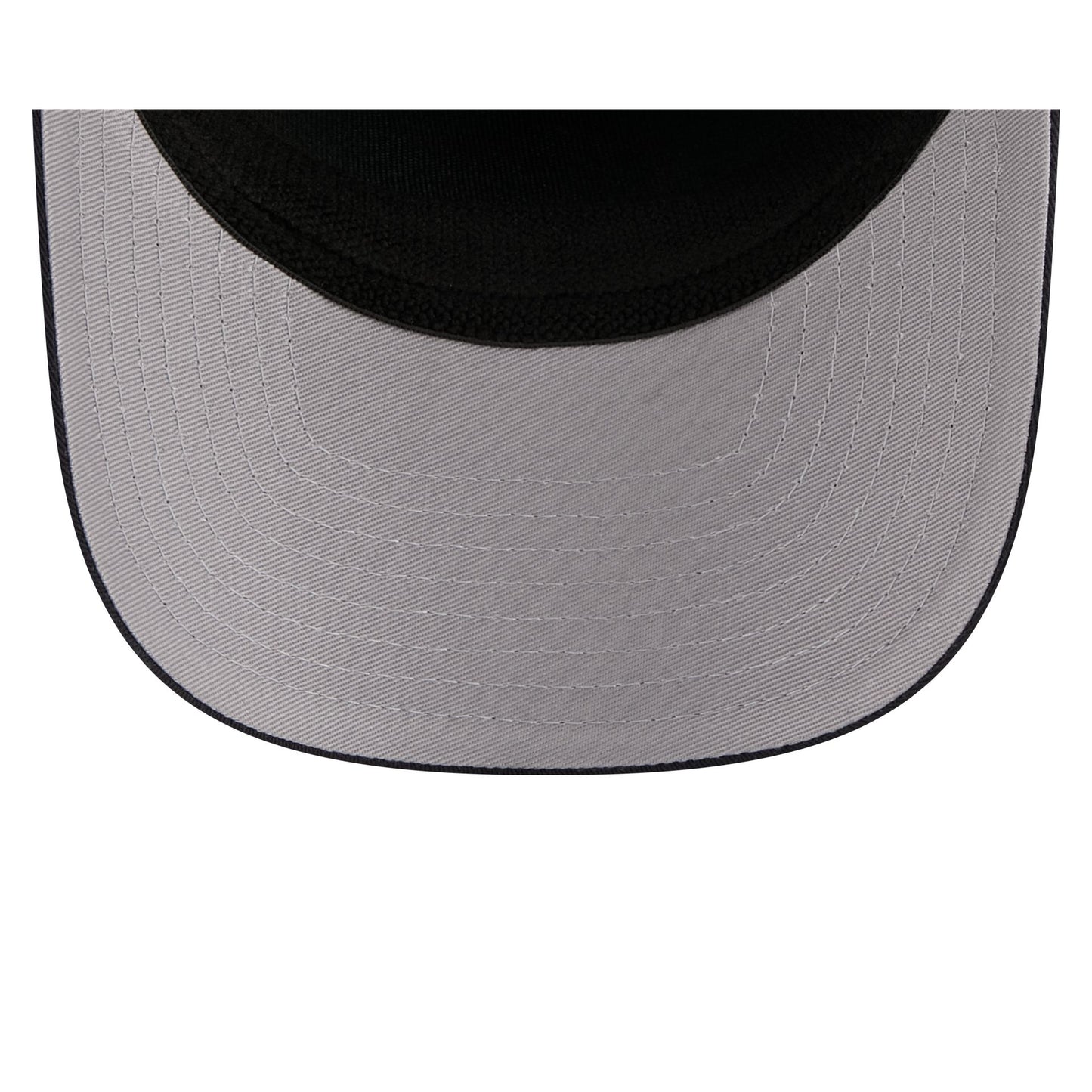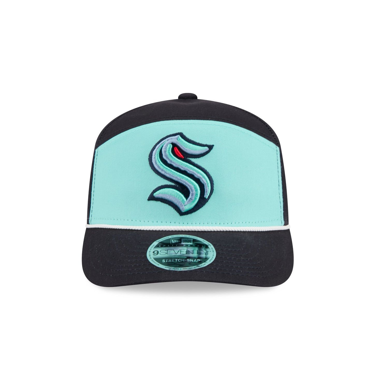 The Seattle Kraken Split Panel 9SEVENTY Stretch-Snap features an embroidered Kraken logo at the front panel with a split crown construction and a rope at the visor. Additional details include an adjustable stretch-snap closure at the rear and a gray undervisor.