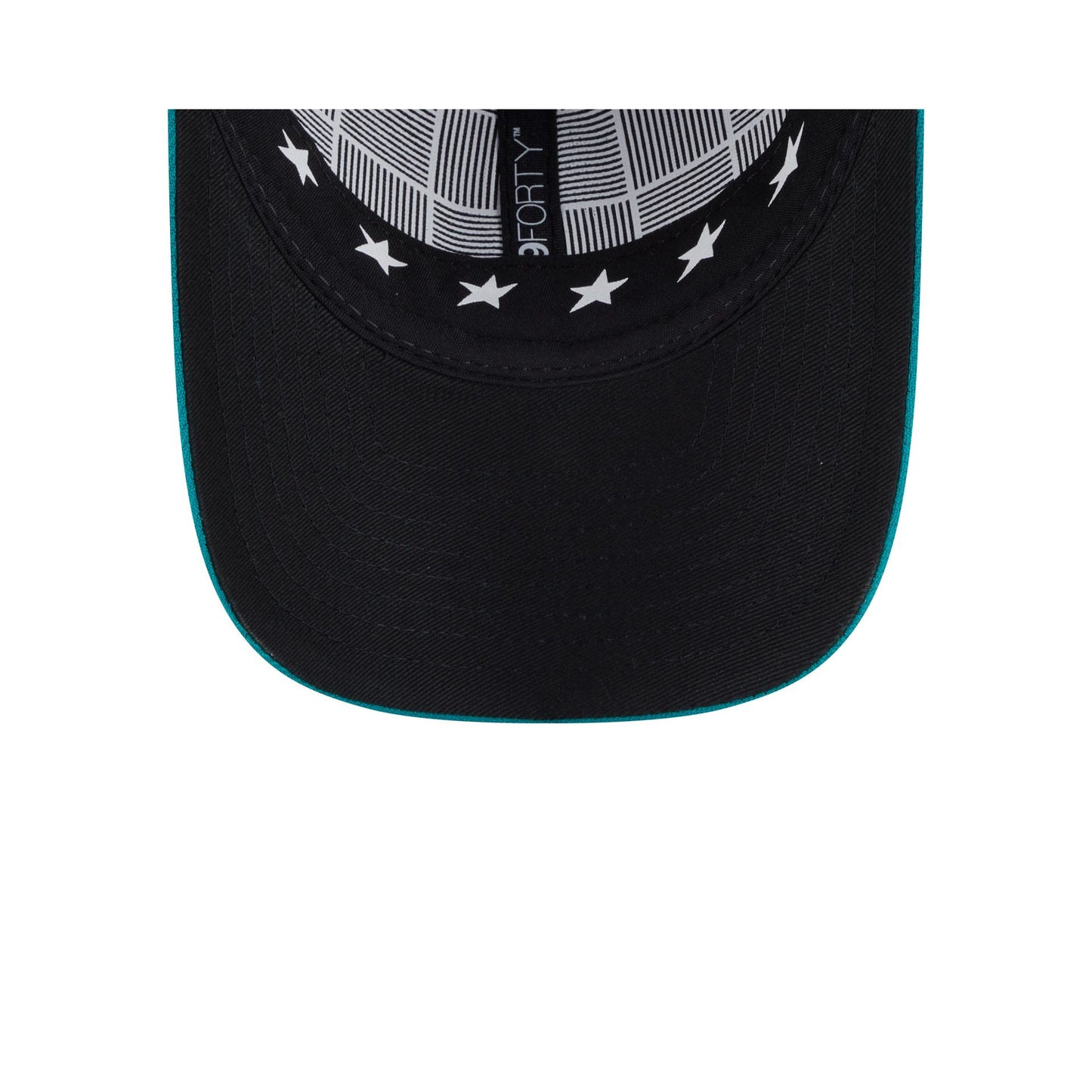 The Seattle Mariners 2025 All-Star Game 9FORTY M-Crown Snapback features an embroidered Mariners logo and stars at the front panels with breathable mesh fabric at the side and rear panels. Additional details include a 2025 All-Star Game patch at the right-wear side, the MLB Batterman logo above a snapback closure at the rear, and a black undervisor. The cap also features screen-printed stars on the sweatband.
