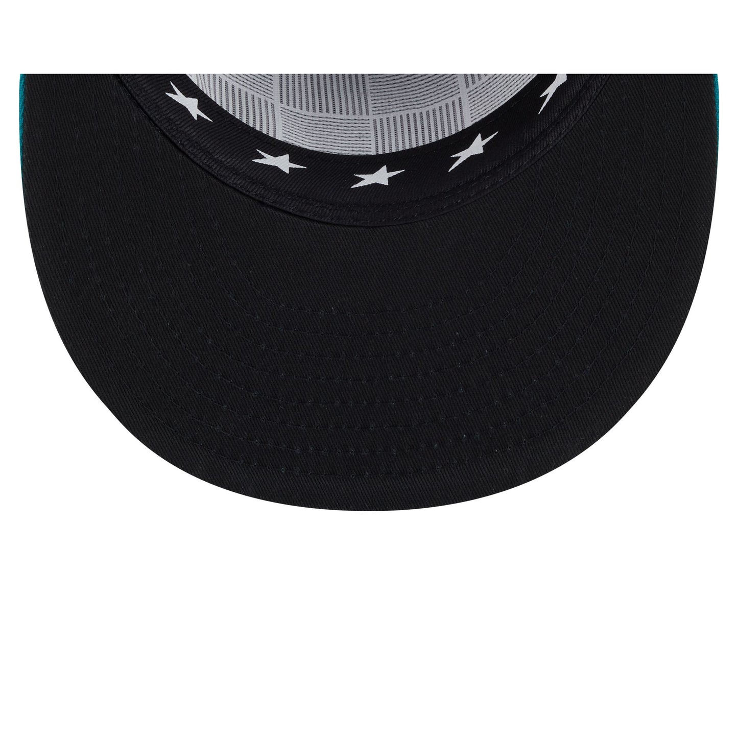 The Seattle Mariners 2025 All-Star Game Split Panel 9FIFTY Snapback features an embroidered Mariners logo at the front panels against a split-crown construction with breathable mesh fabric at the side and rear panels. Additional details include stars at the top panel, a 2025 All-Star Game patch at the right-wear side, the MLB Batterman logo above a snapback closure at the rear, and a black undervisor. The cap also features screen-printed stars on the sweatband.